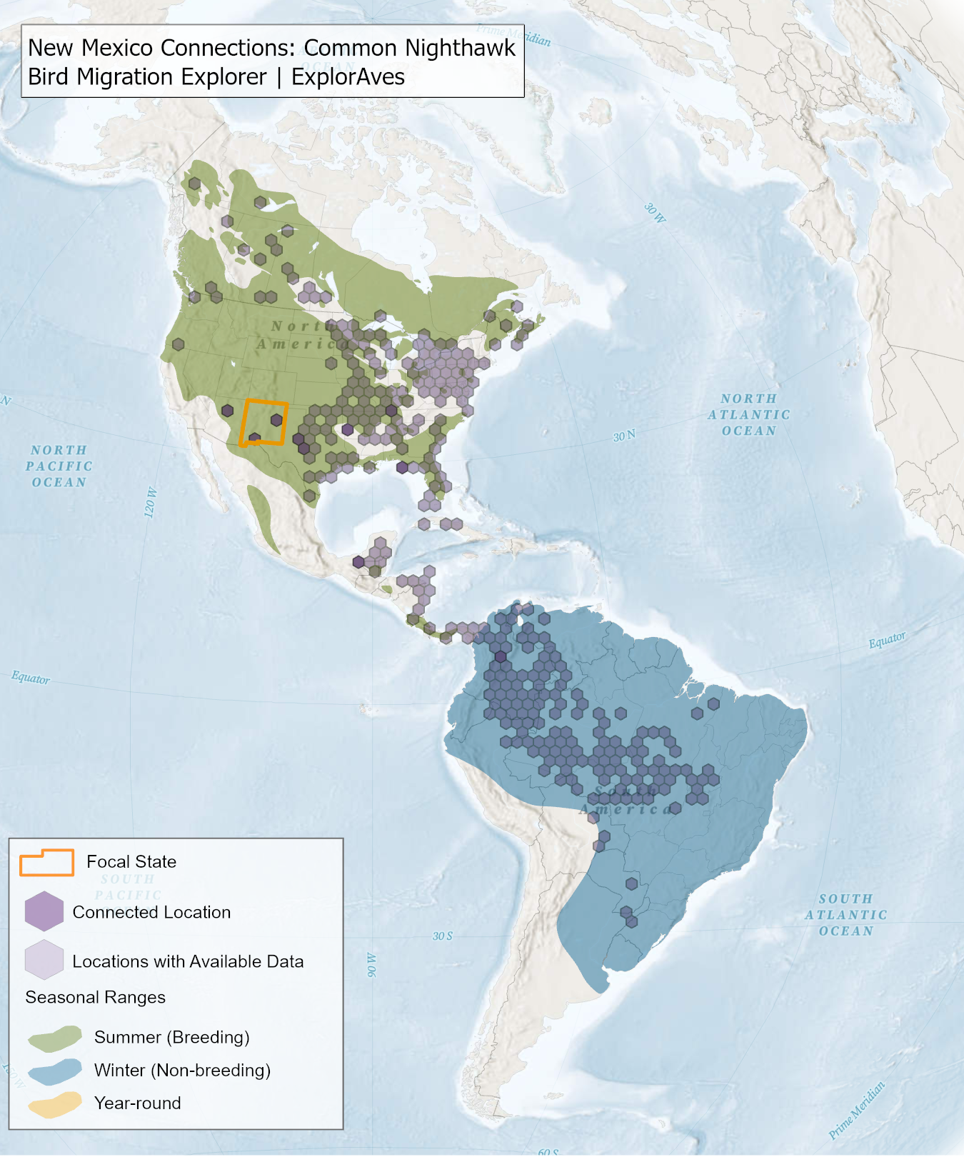 This map shows direct connections between New Mexico and locations across the hemisphere based on available tagging data for individual Common Nighthawk shared by researchers for the Bird Migration Explorer. Data were generously shared by researchers for the Bird Migration Explorer. The map displays the hexagons that are connected to the state (dark purple) as well as hexagons with available tagging data for the species (light purple) with no direct connections to the state. Explore more connections for Common Nighthawk on the Bird Migration Explorer. Download map.