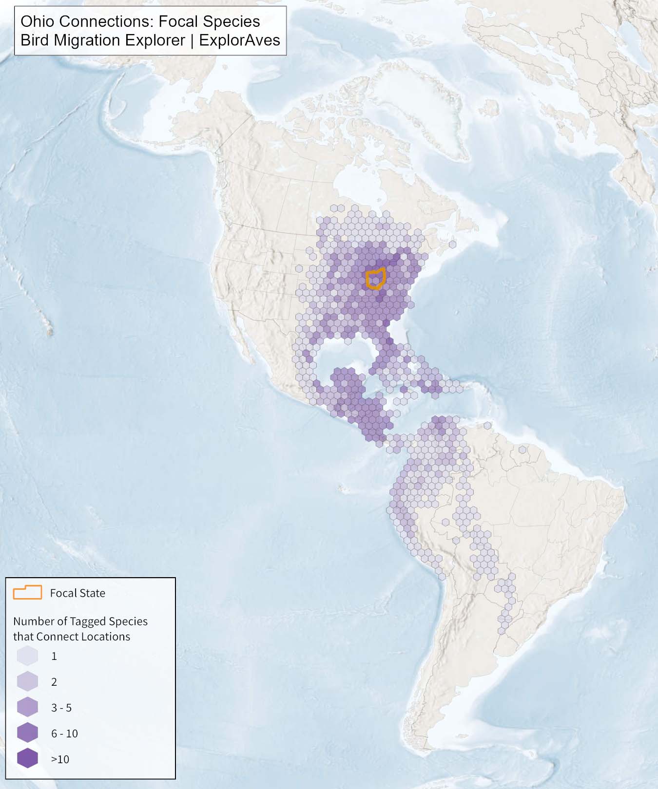 This map shows direct connections between Ohio and other locations across the Western Hemisphere based on tagging data available in the Bird Migration Explorer for the state’s migratory focal species. Connections are based on bird band encounter records, automated radio telemetry, archival geolocators, satellite and GPS tracking, or genetic markers that document the movement of individual birds. The map displays the number of migratory focal species that connect each location (hexagon) to Ohio. While these data offer valuable insight, they do not capture the complete picture of all connections because they only present available tagging data for the subset of species of concern identified by each state. The multi-species tagging connections map illustrates the need to protect, restore, enhance and manage safe habitat in locations connected to the state to ensure migratory species can access the resources they need across the full annual cycle. As individual birds travel between species’ summer (breeding) and winter (stationary non-breeding) ranges, they traverse geopolitical boundaries, underscoring the need for coordinated conservation efforts to maximize the return on conservation investments in Ohio. Additionally, multi-species connection maps illustrate Ohio's crucial role in safeguarding the migratory movements of these species.