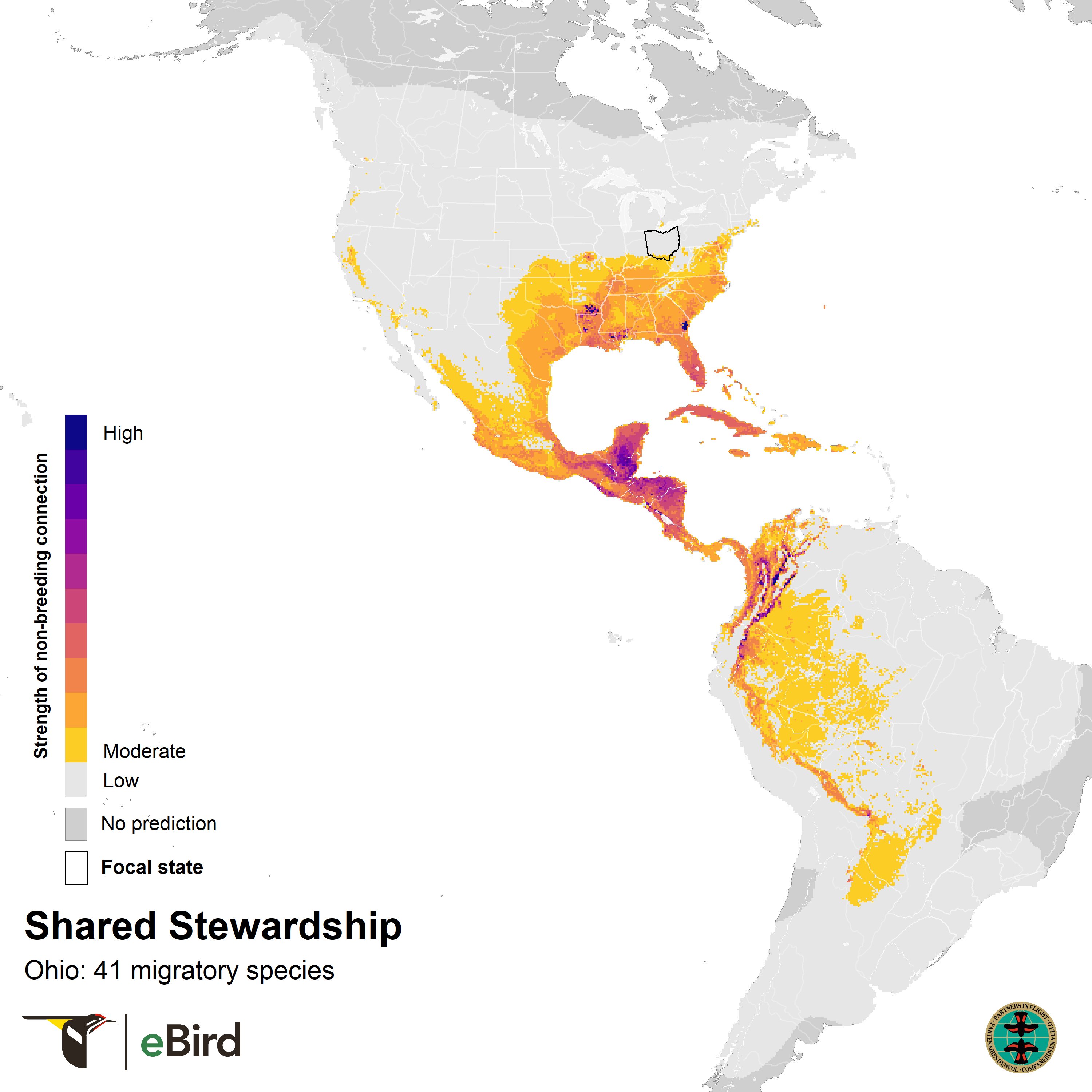 (1) A state-level overview of where the migratory birds that breed in Ohio are found during the non-breeding season based on Shared Stewardship Connection Maps.