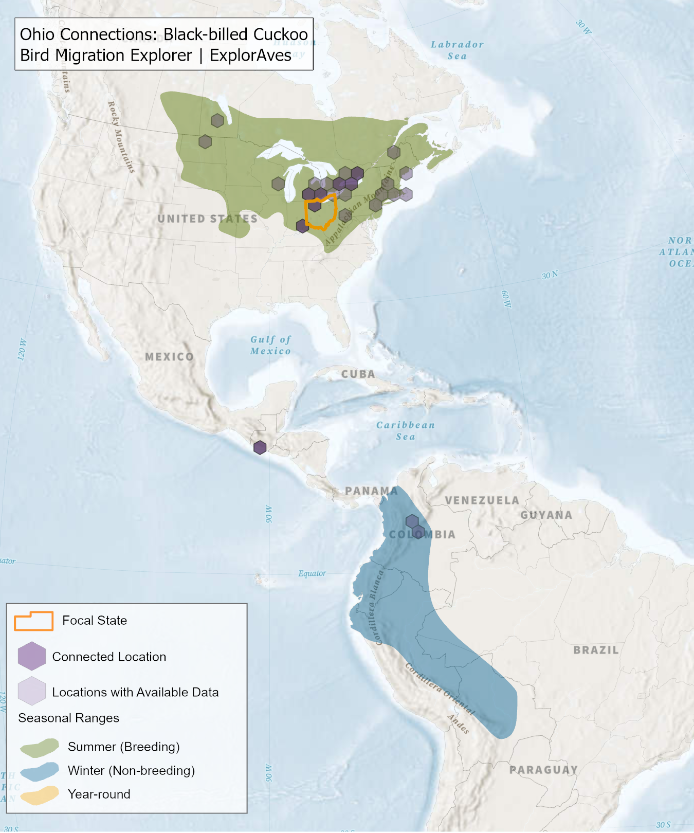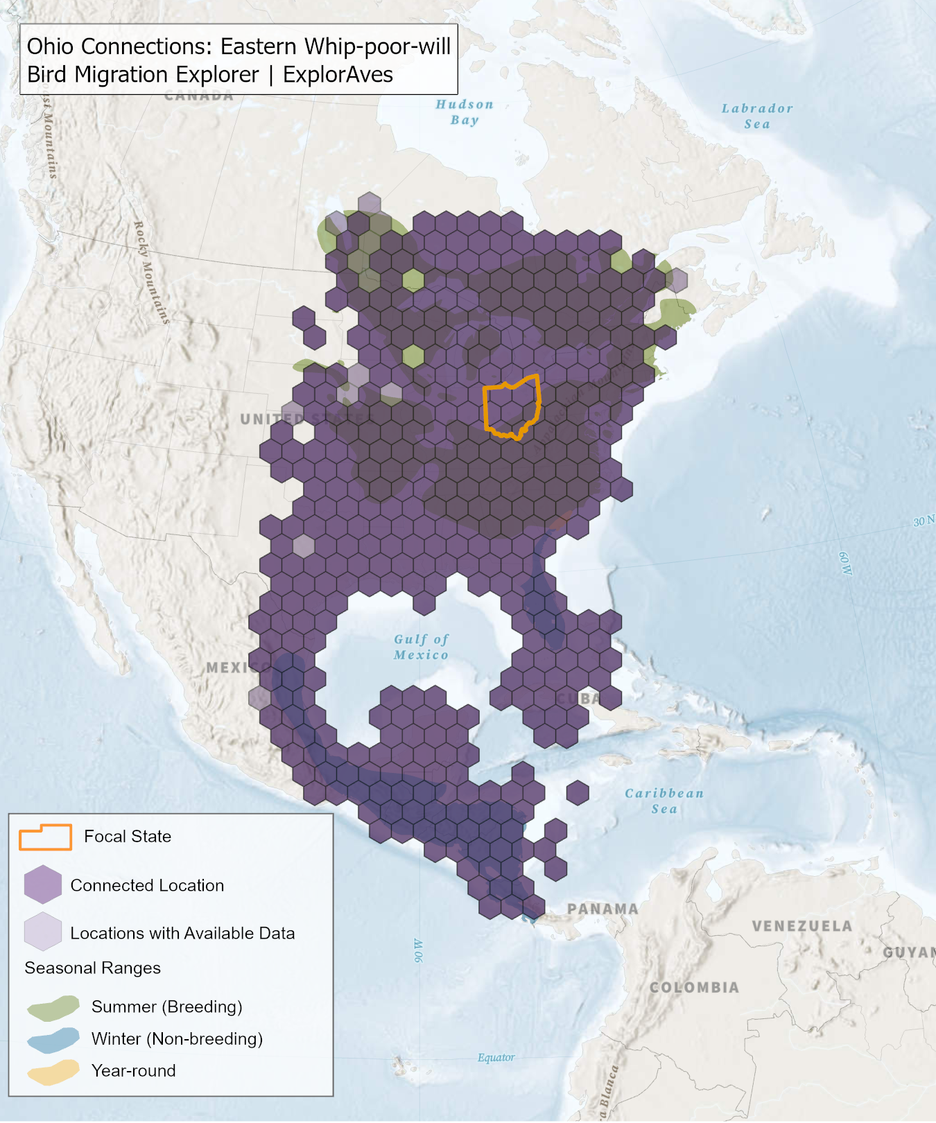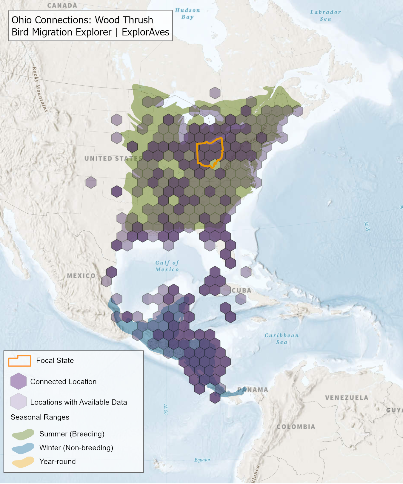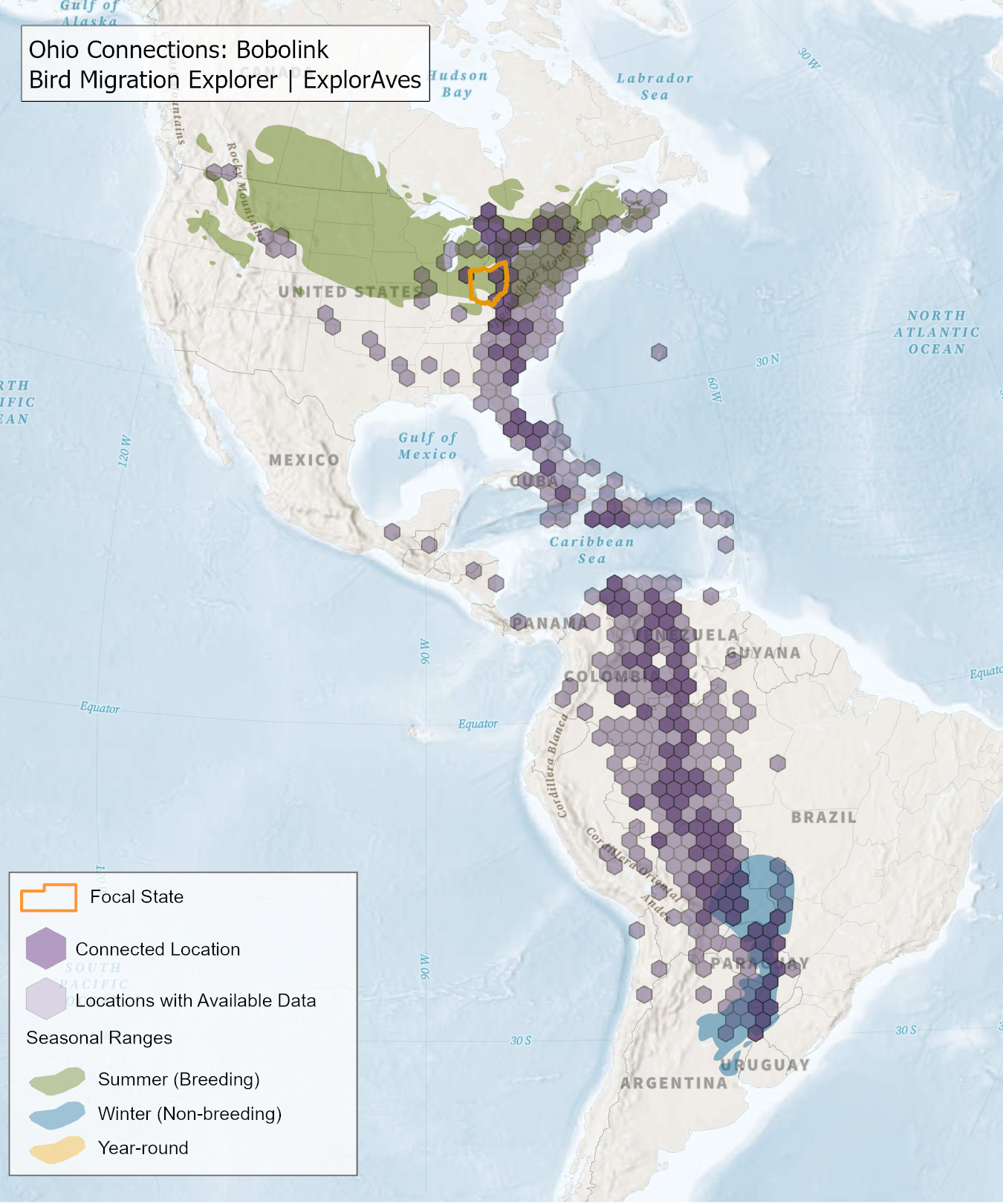 The species connection maps show direct connections between Ohio and locations across the Western Hemisphere based on tagging data in the Bird Migration Explorer available for each of the state’s migratory species of concern. Connections are based on bird band encounter records, automated radio telemetry, archival geolocators, satellite and GPS tracking, or genetic markers that document the movement of individual birds. The maps display locations (i.e., hexagons) that are connected to Ohio (polygon outlined orange) and illustrate the need to protect, restore, enhance and manage safe habitat in those areas to ensure species can satisfy their biological requirements across the full annual cycle. As individual birds travel between the species’ summer (breeding) and winter (stationary non-breeding) ranges, they traverse geopolitical boundaries, underscoring the need for collaborative and coordinated conservation efforts to maximize the return on conservation investments for the species in Ohio. While these maps offer valuable insight, they do not capture the complete picture of all connections, because they only present tagging data available in the Bird Migration Explorer. In some cases, species may not have a connection map, because no tagging data are available.