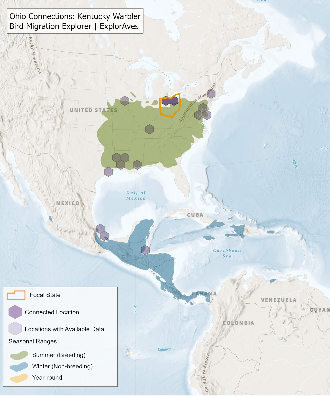 This map shows direct connections between Ohio and locations across the hemisphere based on available tagging data for individual Kentucky Warbler shared by researchers for the Bird Migration Explorer. Data were generously shared by researchers for the Bird Migration Explorer. The map displays the hexagons that are connected to the state (dark purple) as well as hexagons with available tagging data for the species (light purple) with no direct connections to the state. Explore more connections for Kentucky Warbler on the Bird Migration Explorer. Download map.