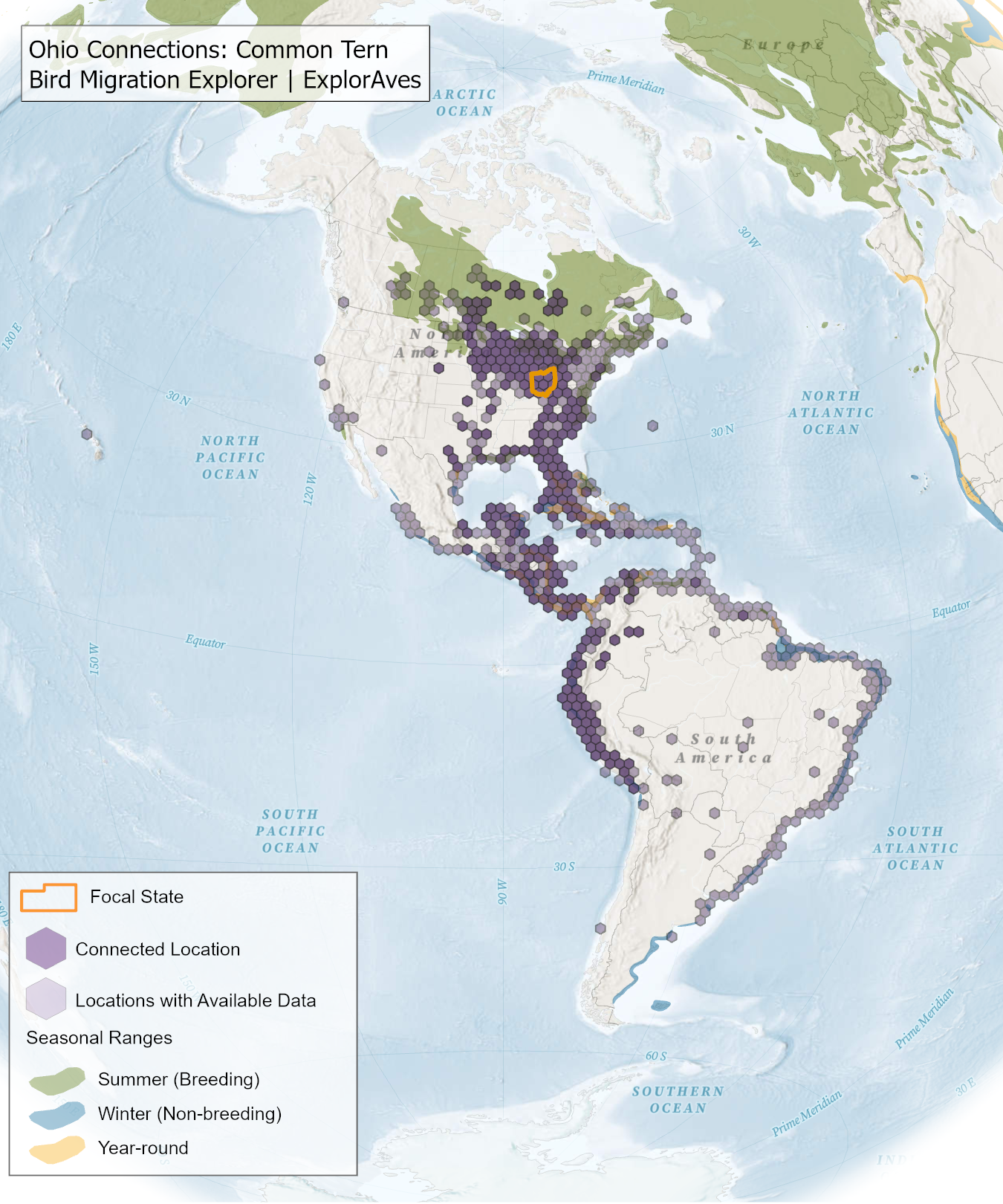 This map shows direct connections between Ohio and locations across the hemisphere based on available tagging data for individual Common Tern shared by researchers for the Bird Migration Explorer. Data were generously shared by researchers for the Bird Migration Explorer. The map displays the hexagons that are connected to the state (dark purple) as well as hexagons with available tagging data for the species (light purple) with no direct connections to the state. Explore more connections for Common Tern on the Bird Migration Explorer. Download map.