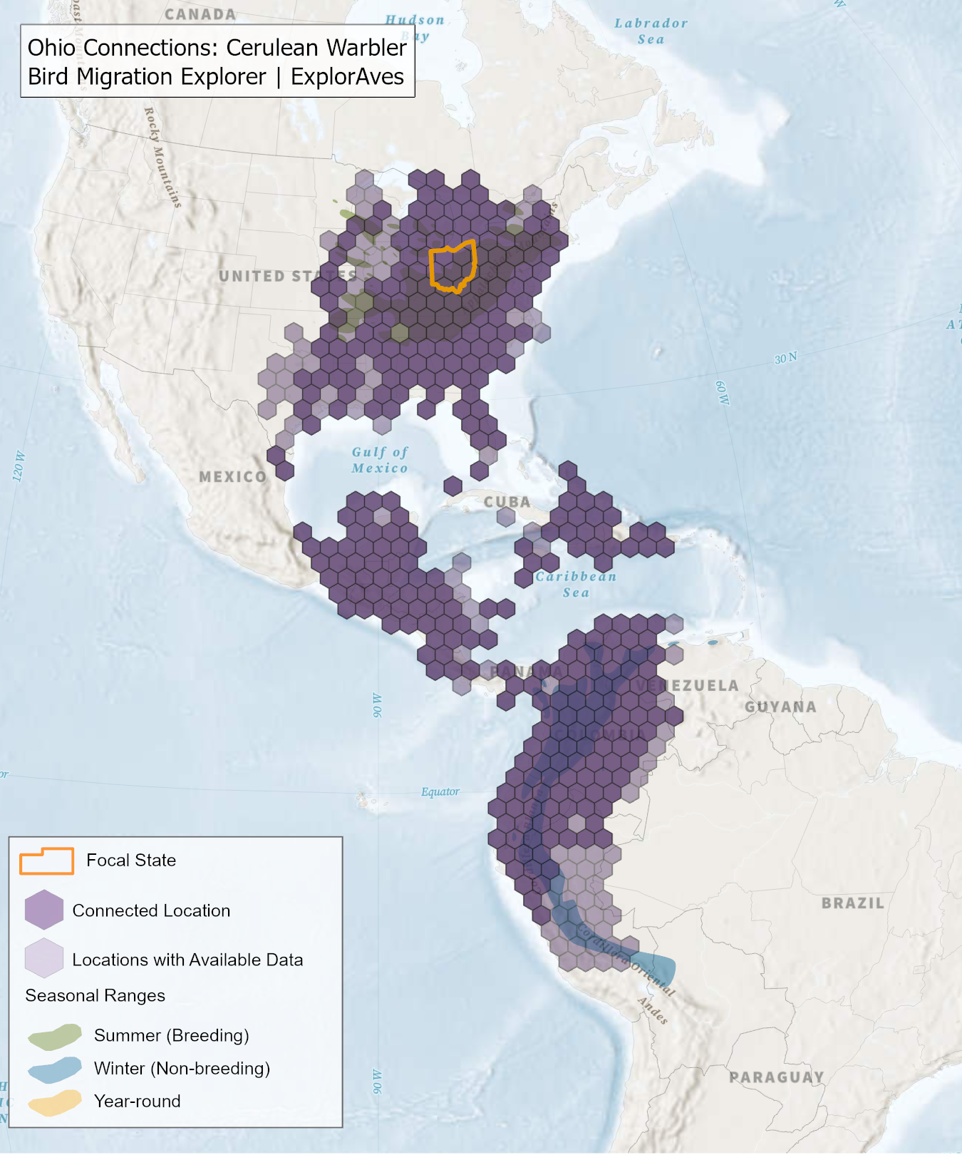 This map shows direct connections between Ohio and locations across the hemisphere based on available tagging data for individual Cerulean Warbler shared by researchers for the Bird Migration Explorer. Data were generously shared by researchers for the Bird Migration Explorer. The map displays the hexagons that are connected to the state (dark purple) as well as hexagons with available tagging data for the species (light purple) with no direct connections to the state. Explore more connections for Cerulean Warbler on the Bird Migration Explorer. Download map.