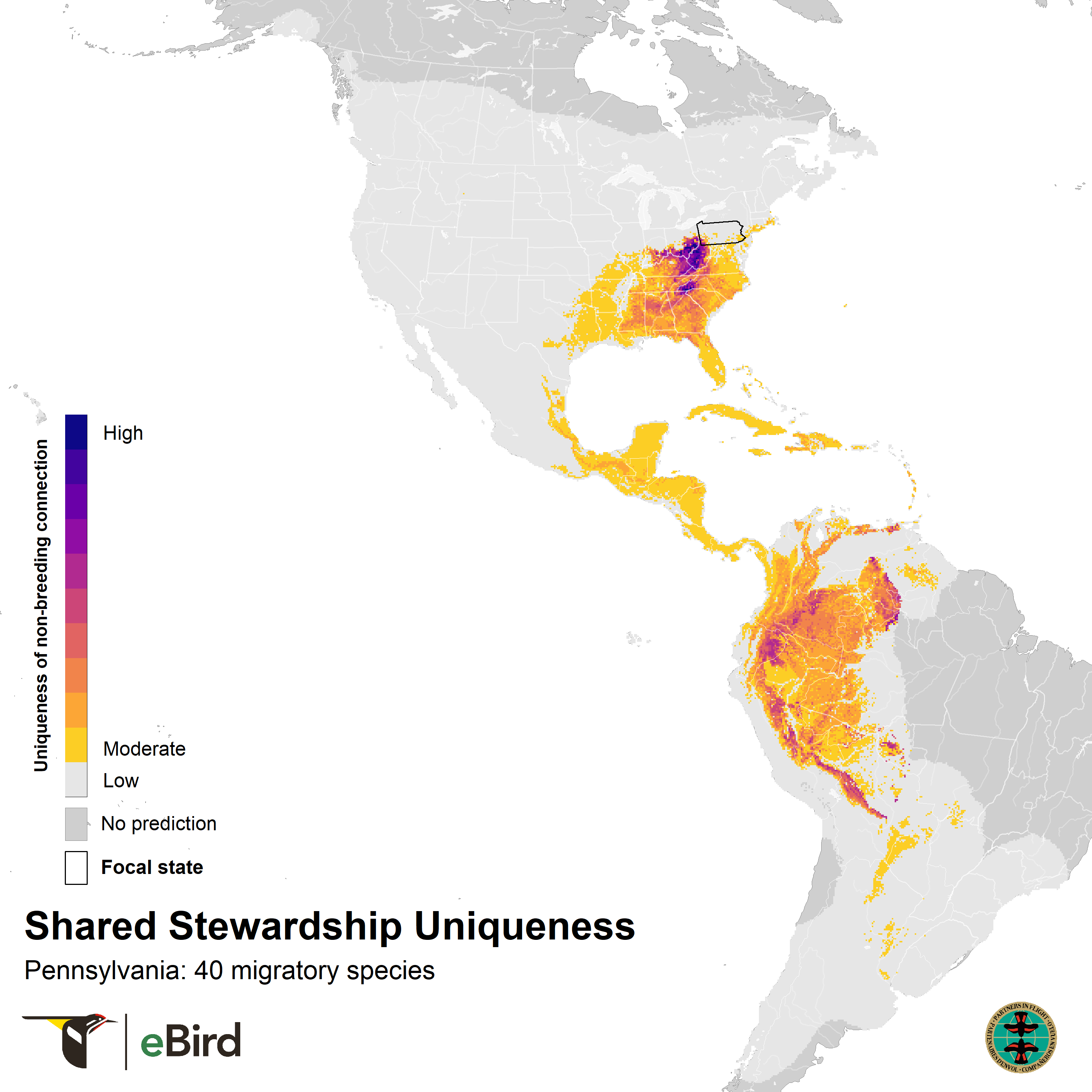These maps show where 40 migratory species that breed in Pennsylvania are concentrated during the nonbreeding season using year-round distribution models from eBird Status and Trends. They highlight opportunities for conservation across the full annual cycle of birds by informing locations for joint stewardship actions. Shared stewardship, on the left, represents the strength of connection between Pennsylvania and the nonbreeding distributions of Pennsylvania's migratory birds. Shared stewardship uniqueness, on the right, shows this information relative to all 50 states, emphasizing the hotspots where Pennsylvania has unique connections compared to other states. The values in each 3 x 3 km pixel combine information on the number of species, the nonbreeding abundances of those species, and the percent of each species’ breeding population in Pennsylvania.