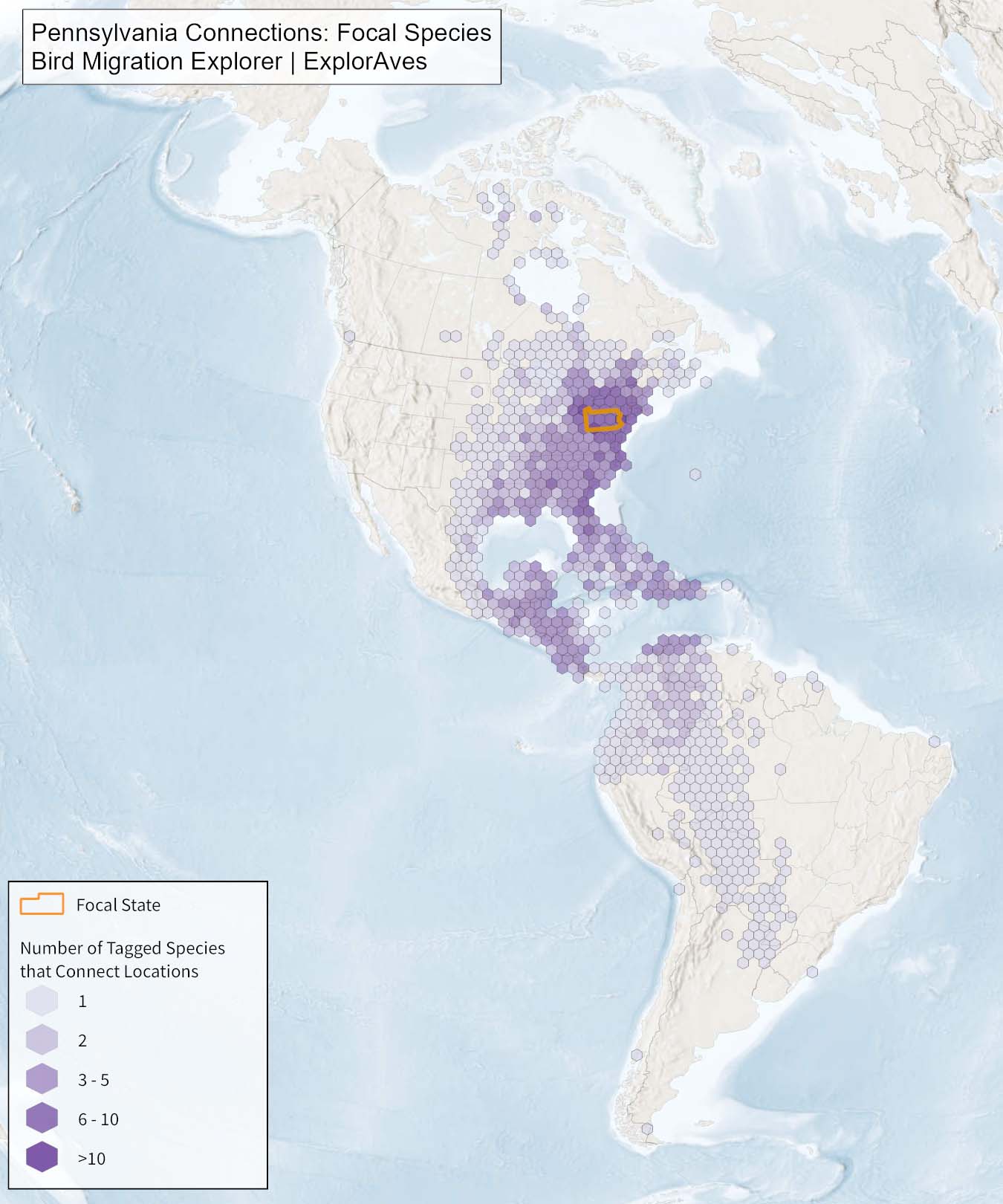 This map shows direct connections between Pennsylvania and other locations across the Western Hemisphere based on tagging data available in the Bird Migration Explorer for the state’s migratory focal species. Connections are based on bird band encounter records, automated radio telemetry, archival geolocators, satellite and GPS tracking, or genetic markers that document the movement of individual birds. The map displays the number of migratory focal species that connect each location (hexagon) to Pennsylvania. While these data offer valuable insight, they do not capture the complete picture of all connections because they only present available tagging data for the subset of species of concern identified by each state. The multi-species tagging connections map illustrates the need to protect, restore, enhance and manage safe habitat in locations connected to the state to ensure migratory species can access the resources they need across the full annual cycle. As individual birds travel between species’ summer (breeding) and winter (stationary non-breeding) ranges, they traverse geopolitical boundaries, underscoring the need for coordinated conservation efforts to maximize the return on conservation investments in Pennsylvania. Additionally, multi-species connection maps illustrate Pennsylvania's crucial role in safeguarding the migratory movements of these species.