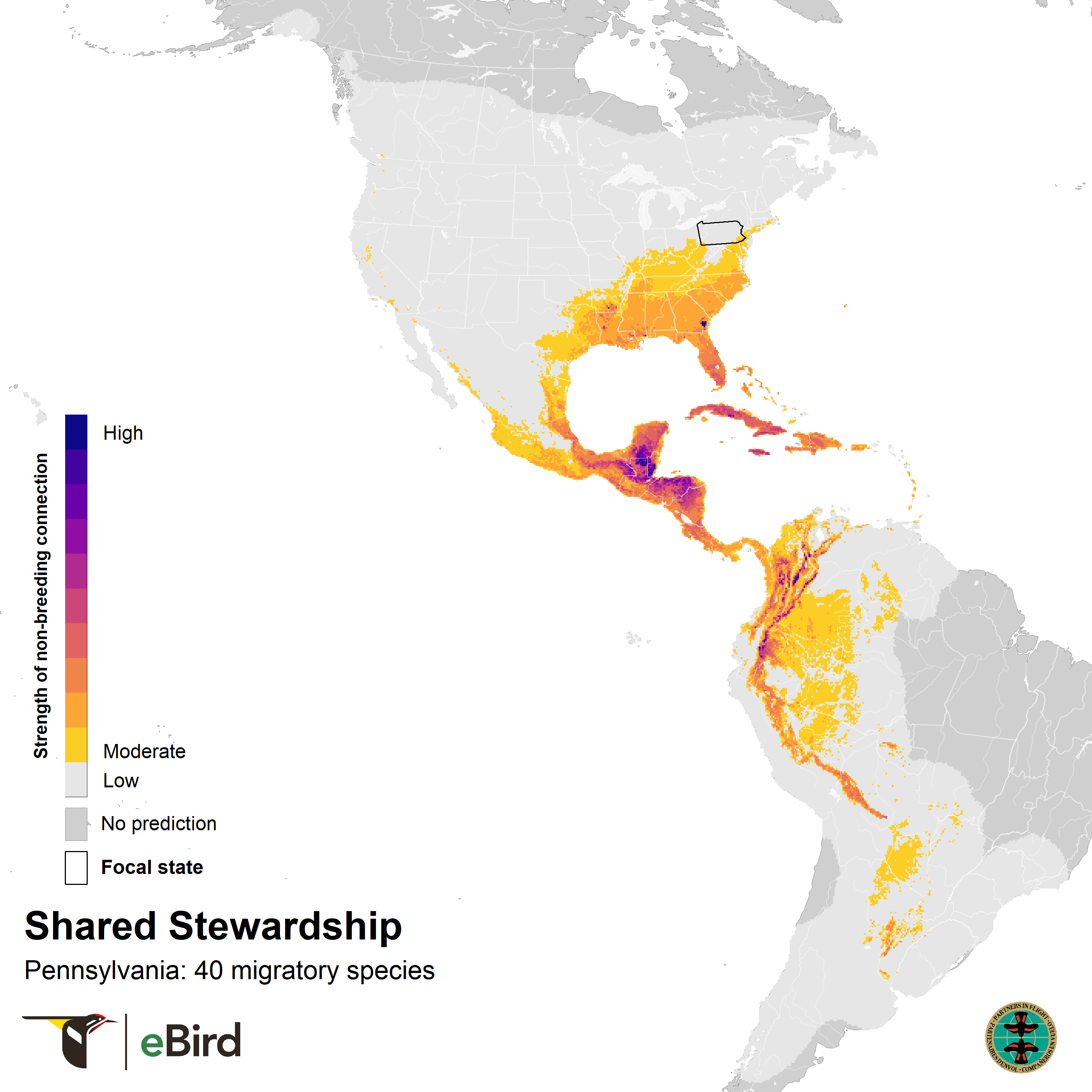 (1) A state-level overview of where the migratory birds that breed in Pennsylvania are found during the non-breeding season based on Shared Stewardship Connection Maps.