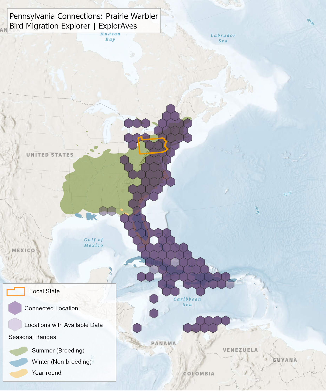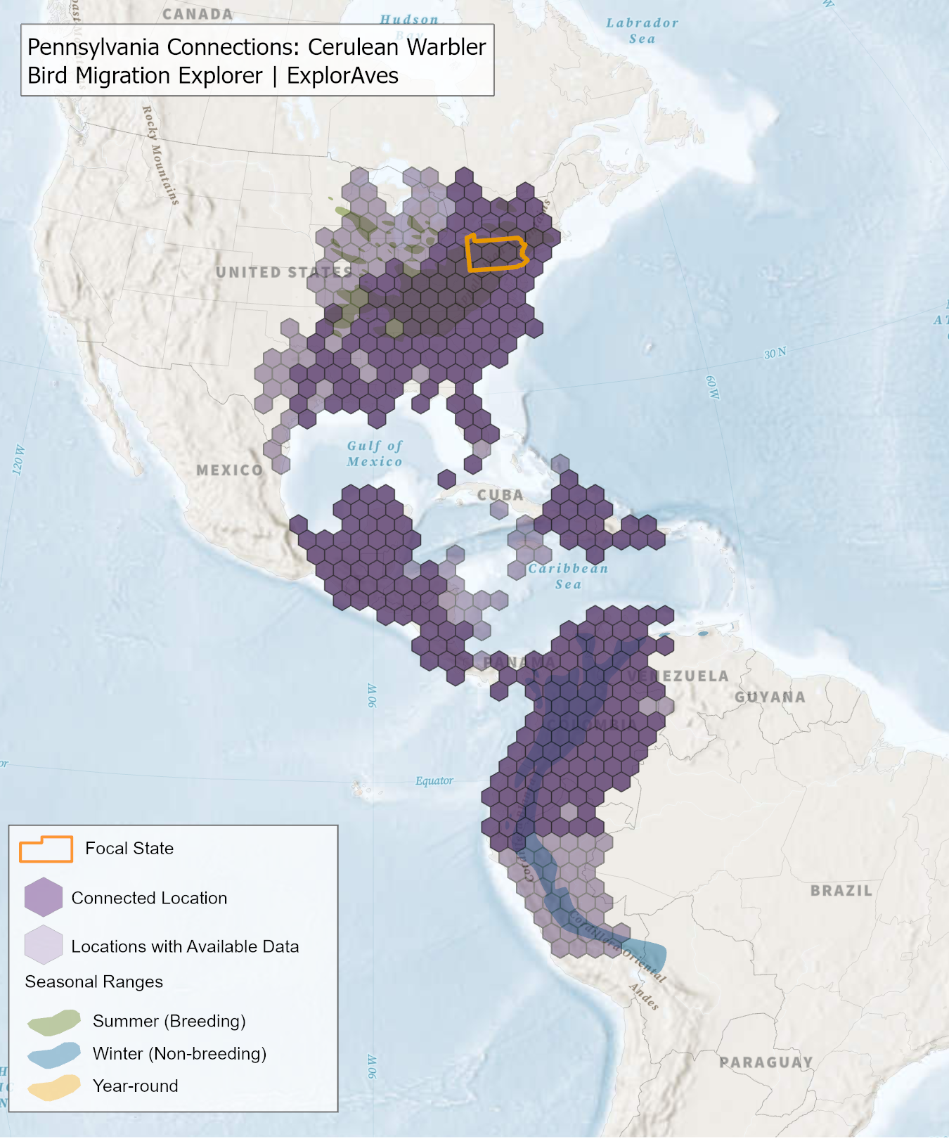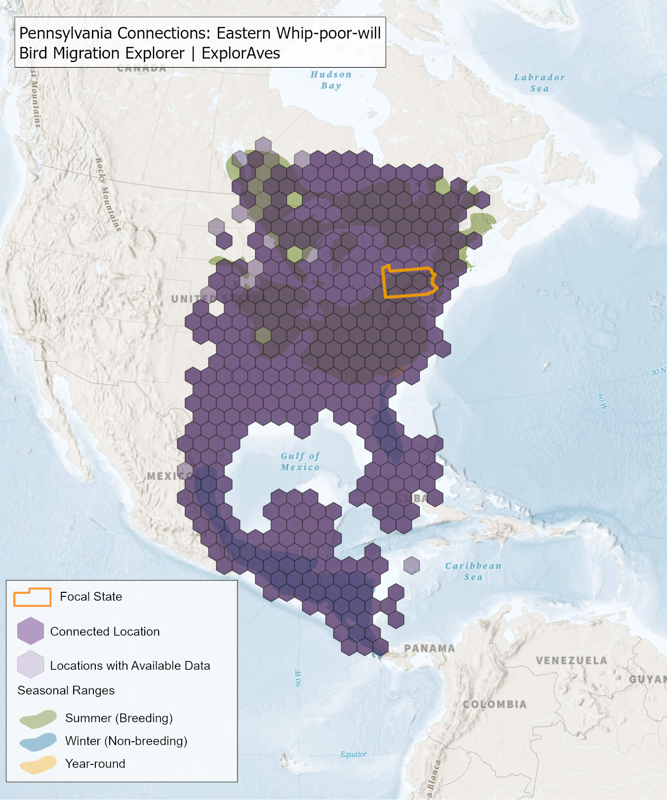 The species connection maps show direct connections between Pennsylvania and locations across the Western Hemisphere based on tagging data in the Bird Migration Explorer available for each of the state’s migratory species of concern. Connections are based on bird band encounter records, automated radio telemetry, archival geolocators, satellite and GPS tracking, or genetic markers that document the movement of individual birds. The maps display locations (i.e., hexagons) that are connected to Pennsylvania (polygon outlined orange) and illustrate the need to protect, restore, enhance and manage safe habitat in those areas to ensure species can satisfy their biological requirements across the full annual cycle. As individual birds travel between the species’ summer (breeding) and winter (stationary non-breeding) ranges, they traverse geopolitical boundaries, underscoring the need for collaborative and coordinated conservation efforts to maximize the return on conservation investments for the species in Pennsylvania. While these maps offer valuable insight, they do not capture the complete picture of all connections, because they only present tagging data available in the Bird Migration Explorer. In some cases, species may not have a connection map, because no tagging data are available.