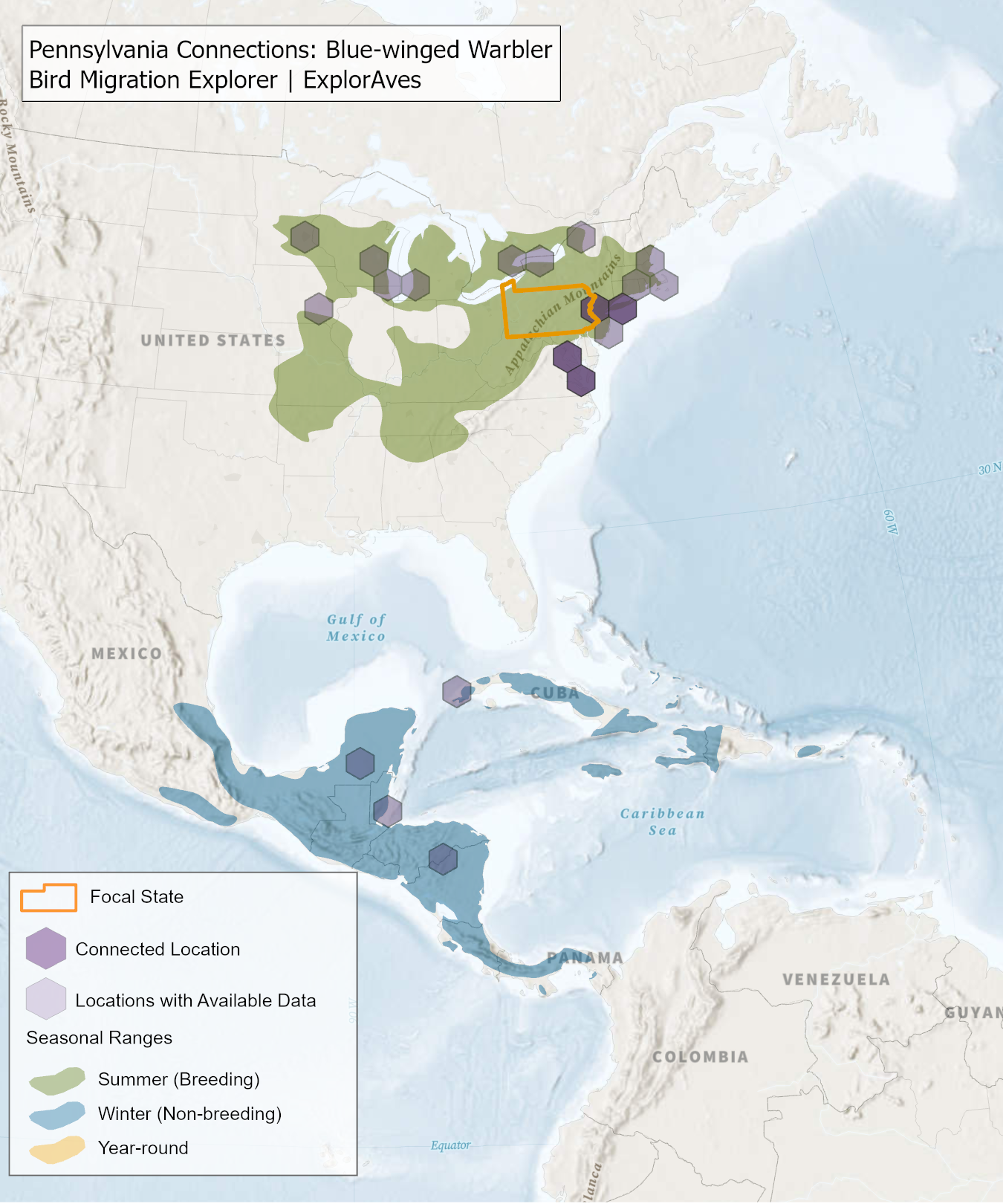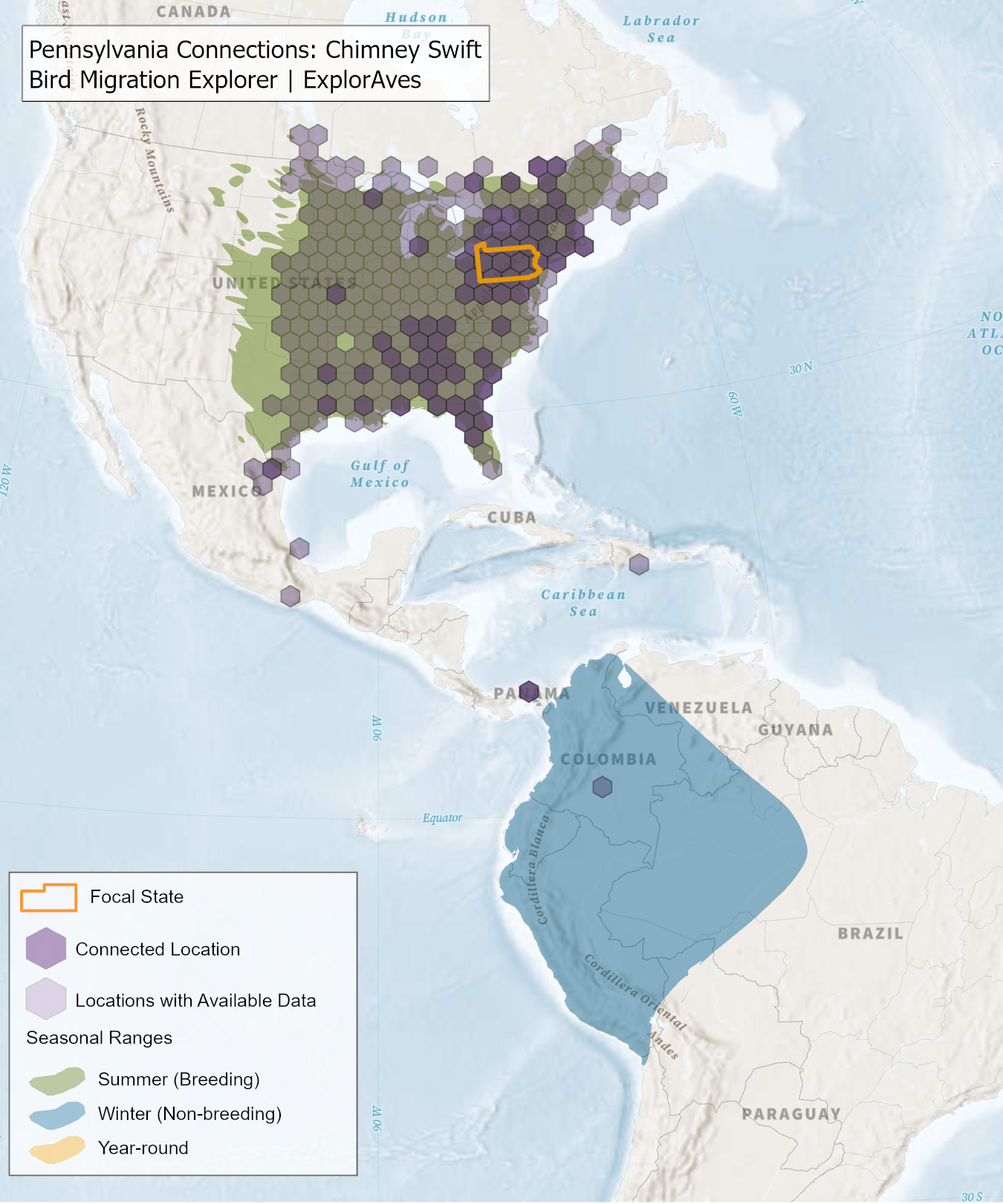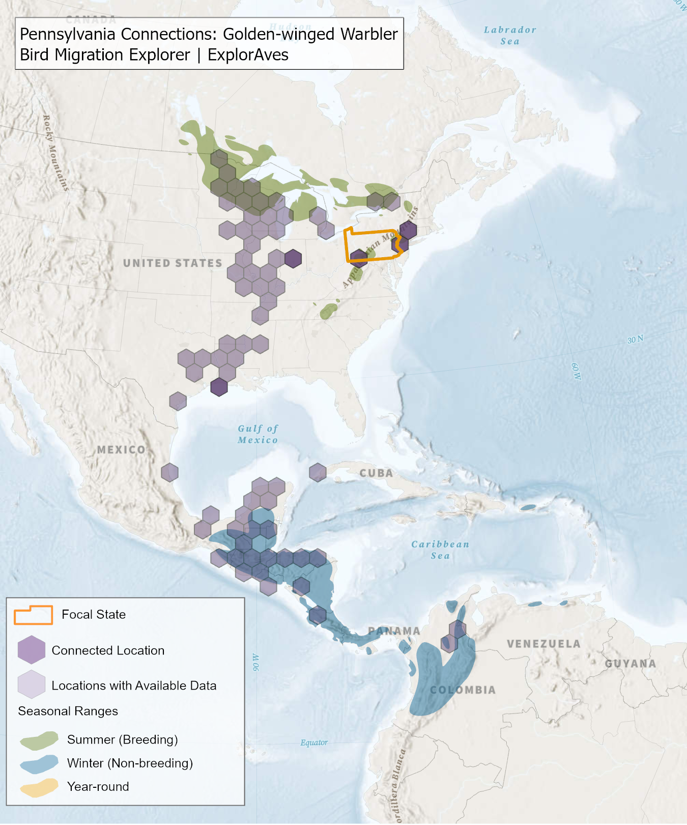 The species connection maps show direct connections between Pennsylvania and locations across the Western Hemisphere based on tagging data in the Bird Migration Explorer available for each of the state’s migratory species of concern. Connections are based on bird band encounter records, automated radio telemetry, archival geolocators, satellite and GPS tracking, or genetic markers that document the movement of individual birds. The maps display locations (i.e., hexagons) that are connected to Pennsylvania (polygon outlined orange) and illustrate the need to protect, restore, enhance and manage safe habitat in those areas to ensure species can satisfy their biological requirements across the full annual cycle. As individual birds travel between the species’ summer (breeding) and winter (stationary non-breeding) ranges, they traverse geopolitical boundaries, underscoring the need for collaborative and coordinated conservation efforts to maximize the return on conservation investments for the species in Pennsylvania. While these maps offer valuable insight, they do not capture the complete picture of all connections, because they only present tagging data available in the Bird Migration Explorer. In some cases, species may not have a connection map, because no tagging data are available.