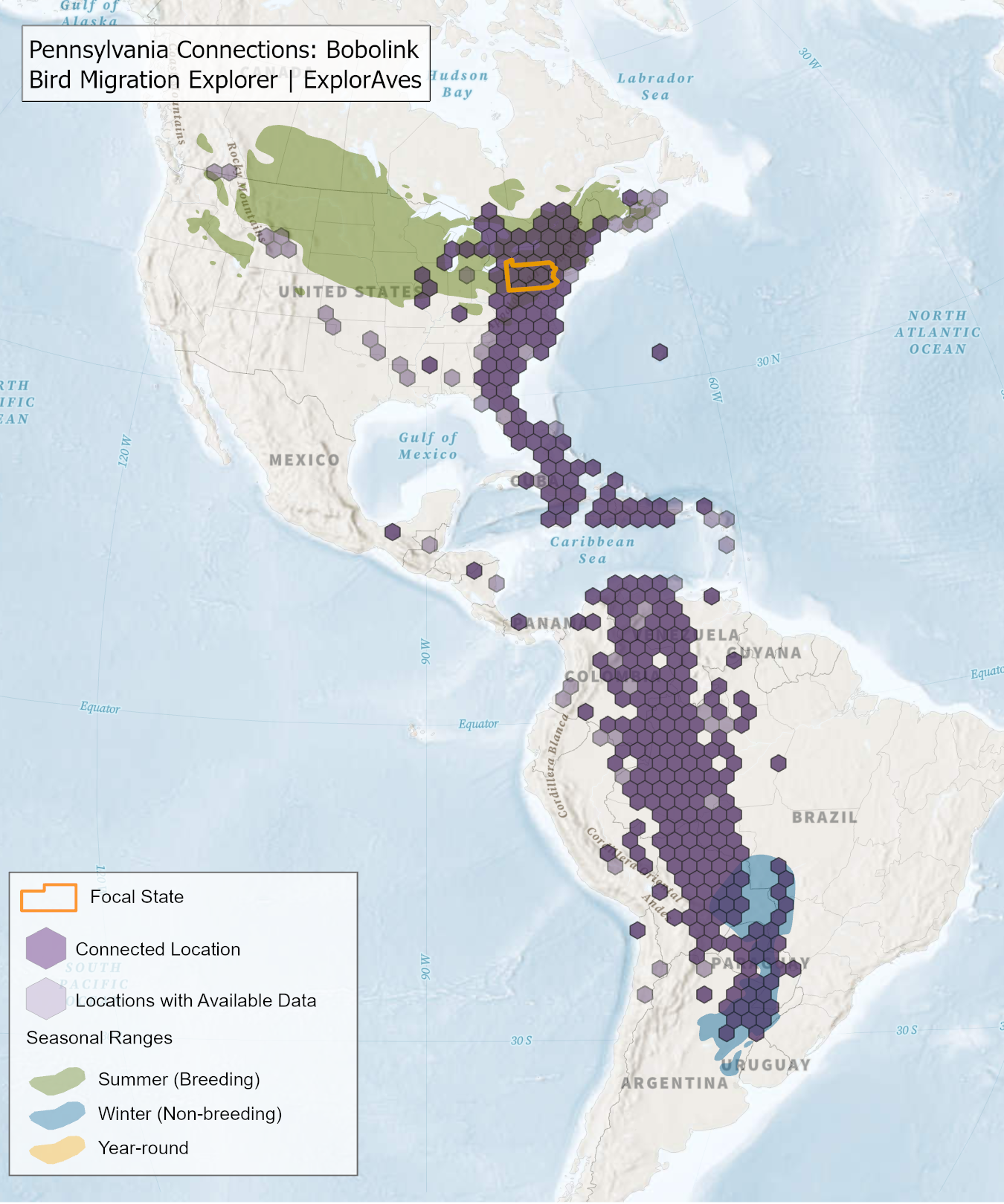 This map shows direct connections between Pennsylvania and locations across the hemisphere based on available tagging data for individual Bobolink shared by researchers for the Bird Migration Explorer. Data were generously shared by researchers for the Bird Migration Explorer. The map displays the hexagons that are connected to the state (dark purple) as well as hexagons with available tagging data for the species (light purple) with no direct connections to the state. Explore more connections for Bobolink on the Bird Migration Explorer. Download map.