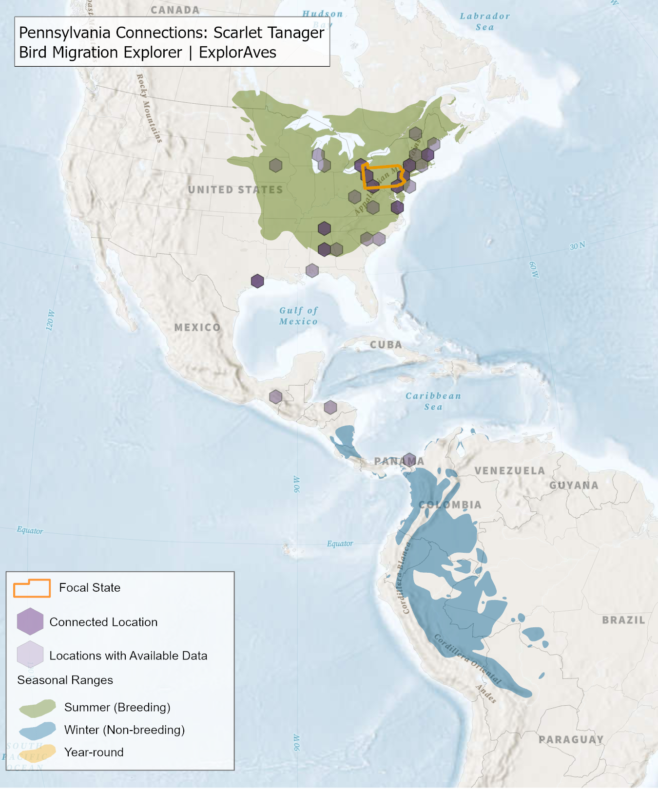 This map shows direct connections between Pennsylvania and locations across the hemisphere based on available tagging data for individual Scarlet Tanager shared by researchers for the Bird Migration Explorer. Data were generously shared by researchers for the Bird Migration Explorer. The map displays the hexagons that are connected to the state (dark purple) as well as hexagons with available tagging data for the species (light purple) with no direct connections to the state. Explore more connections for Scarlet Tanager on the Bird Migration Explorer. Download map.