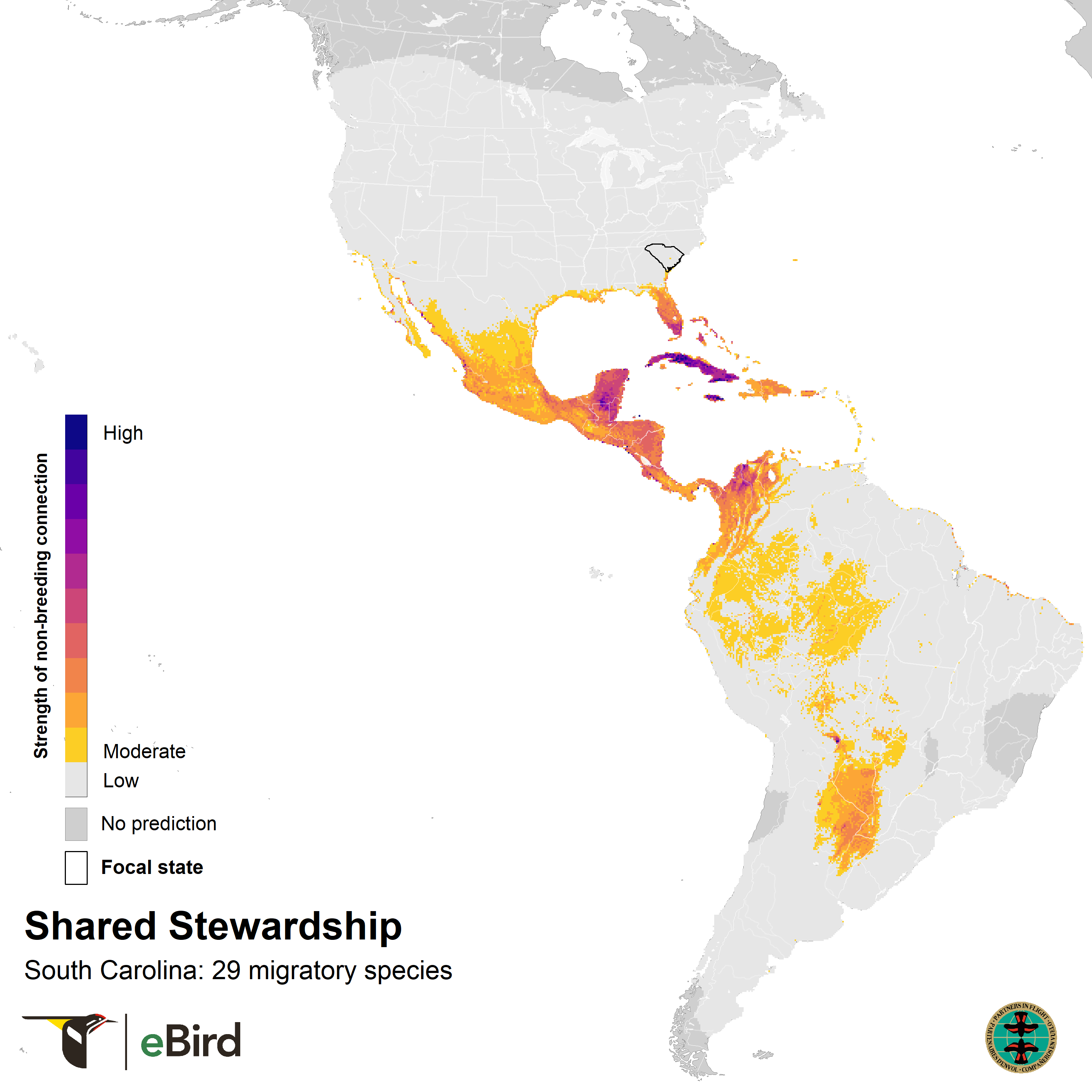 These maps used modeled information on the relative abundance and percent of population of bird species from eBird Status and Trends. Shared Stewardship maps are weighted sums of species’ nonbreeding populations at 3 x 3 km resolution, with the percentage of a species’ breeding population in South Carolina state as the weight. Thus, if a species has a higher percent breeding population in a state, its nonbreeding map will contribute more to that state’s shared stewardship. Shared stewardship uniqueness maps show these values relative to the total connections across all 50 U.S.A. states by calculating the proportion of the total connection strength attributed to South Carolina in each pixel. Download the complete list of species included in this map. For more information visit FAQs and eBird’s portal for state-level summaries.