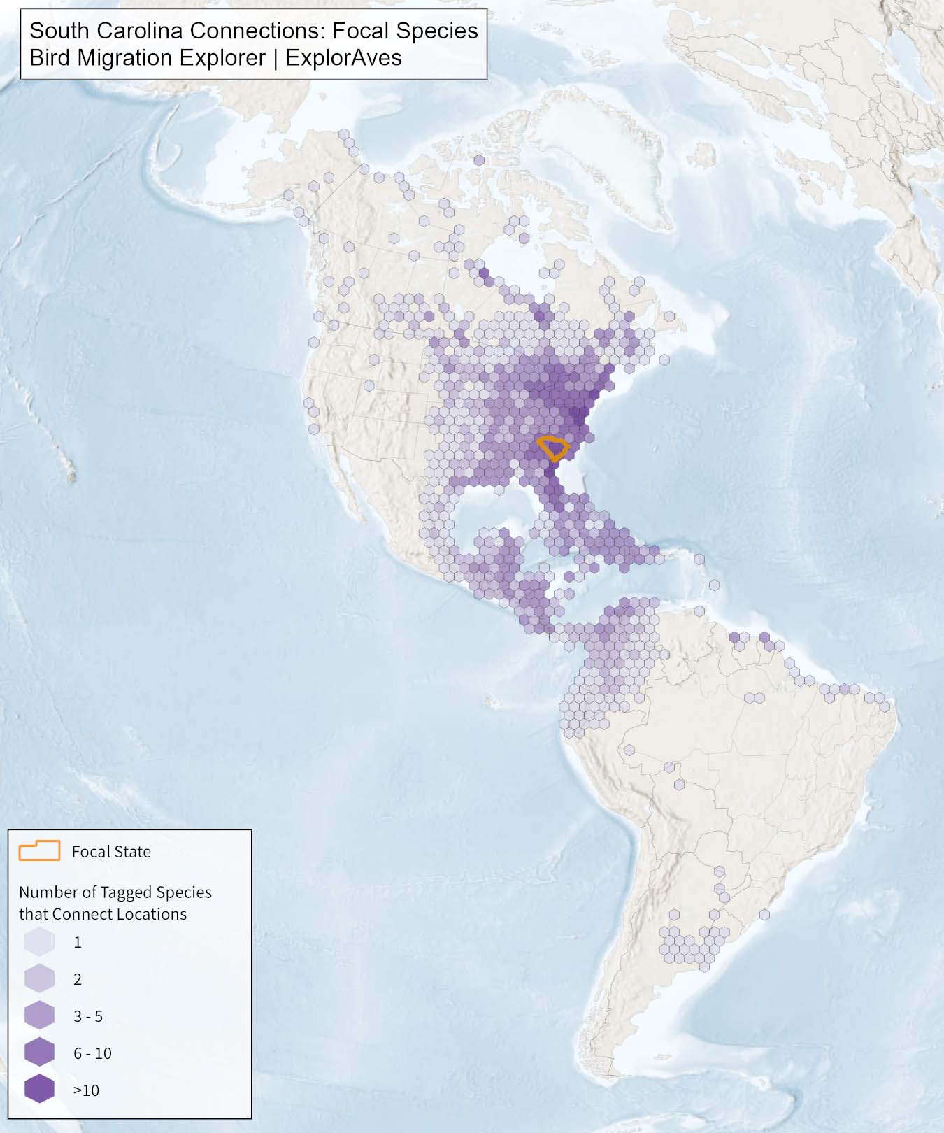 This map shows direct connections between South Carolina and other locations across the Western Hemisphere based on tagging data available in the Bird Migration Explorer for the state’s migratory focal species. Connections are based on bird band encounter records, automated radio telemetry, archival geolocators, satellite and GPS tracking, or genetic markers that document the movement of individual birds. The map displays the number of migratory focal species that connect each location (hexagon) to South Carolina. While these data offer valuable insight, they do not capture the complete picture of all connections because they only present available tagging data for the subset of species of concern identified by each state. The multi-species tagging connections map illustrates the need to protect, restore, enhance and manage safe habitat in locations connected to the state to ensure migratory species can access the resources they need across the full annual cycle. As individual birds travel between species’ summer (breeding) and winter (stationary non-breeding) ranges, they traverse geopolitical boundaries, underscoring the need for coordinated conservation efforts to maximize the return on conservation investments in South Carolina. Additionally, multi-species connection maps illustrate South Carolina's crucial role in safeguarding the migratory movements of these species.