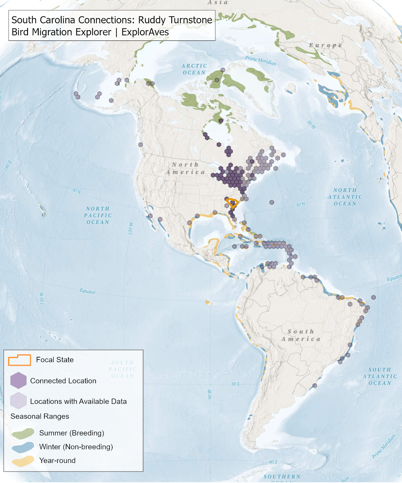 This map shows direct connections between South Carolina and locations across the hemisphere based on available tagging data for individual Ruddy Turnstone shared by researchers for the Bird Migration Explorer. Data were generously shared by researchers for the Bird Migration Explorer. The map displays the hexagons that are connected to the state (dark purple) as well as hexagons with available tagging data for the species (light purple) with no direct connections to the state. Explore more connections for Ruddy Turnstone on the Download map.