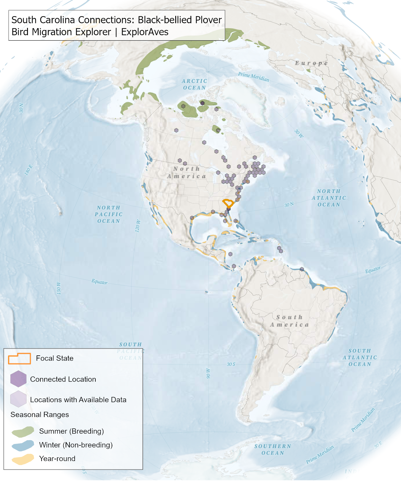 This map shows direct connections between South Carolina and locations across the hemisphere based on available tagging data for individual Black-bellied Plover shared by researchers for the Bird Migration Explorer. Data were generously shared by researchers for the Bird Migration Explorer. The map displays the hexagons that are connected to the state (dark purple) as well as hexagons with available tagging data for the species (light purple) with no direct connections to the state. Explore more connections for Black-bellied Plover on the Download map.