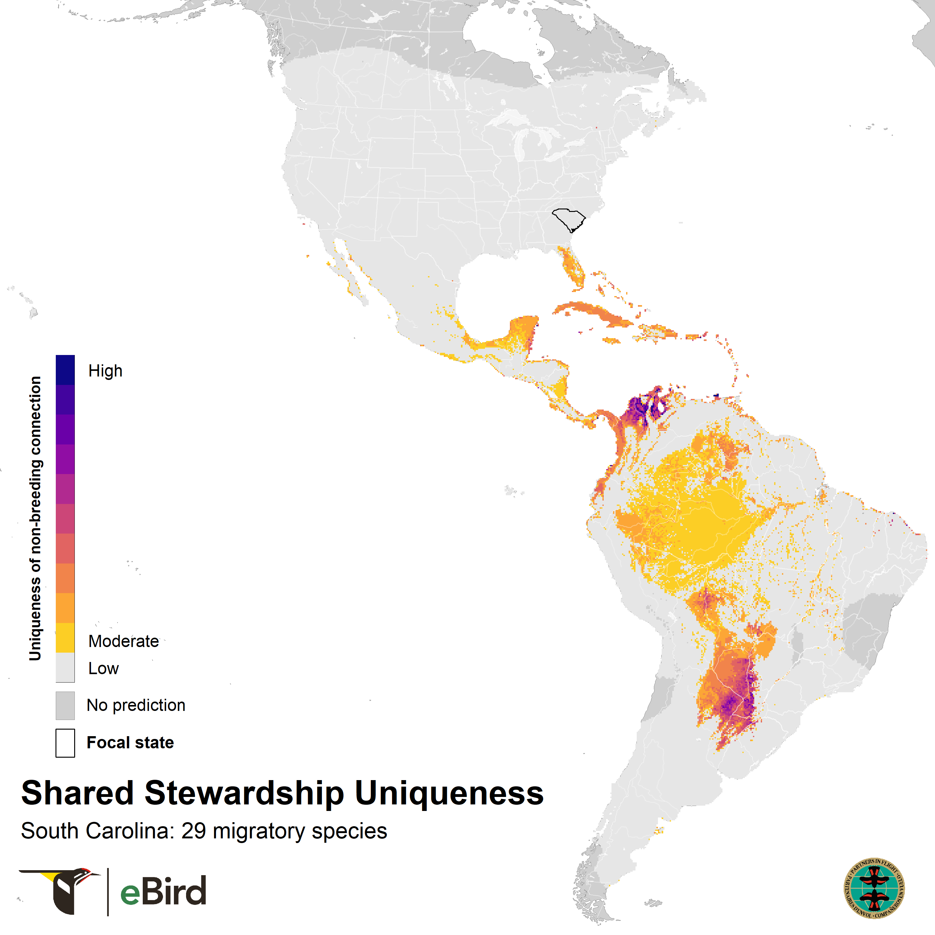 These maps show where 29 migratory species that breed in South Carolina are concentrated during the nonbreeding season using year-round distribution models from eBird Status and Trends. They highlight opportunities for conservation across the full annual cycle of birds by informing locations for joint stewardship actions. Shared stewardship, on the left, represents the strength of connection between South Carolina and the nonbreeding distributions of South Carolina's migratory birds. Shared stewardship uniqueness, on the right, shows this information relative to all 50 states, emphasizing the hotspots where South Carolina has unique connections compared to other states. The values in each 3 x 3 km pixel combine information on the number of species, the nonbreeding abundances of those species, and the percent of each species’ breeding population in South Carolina.