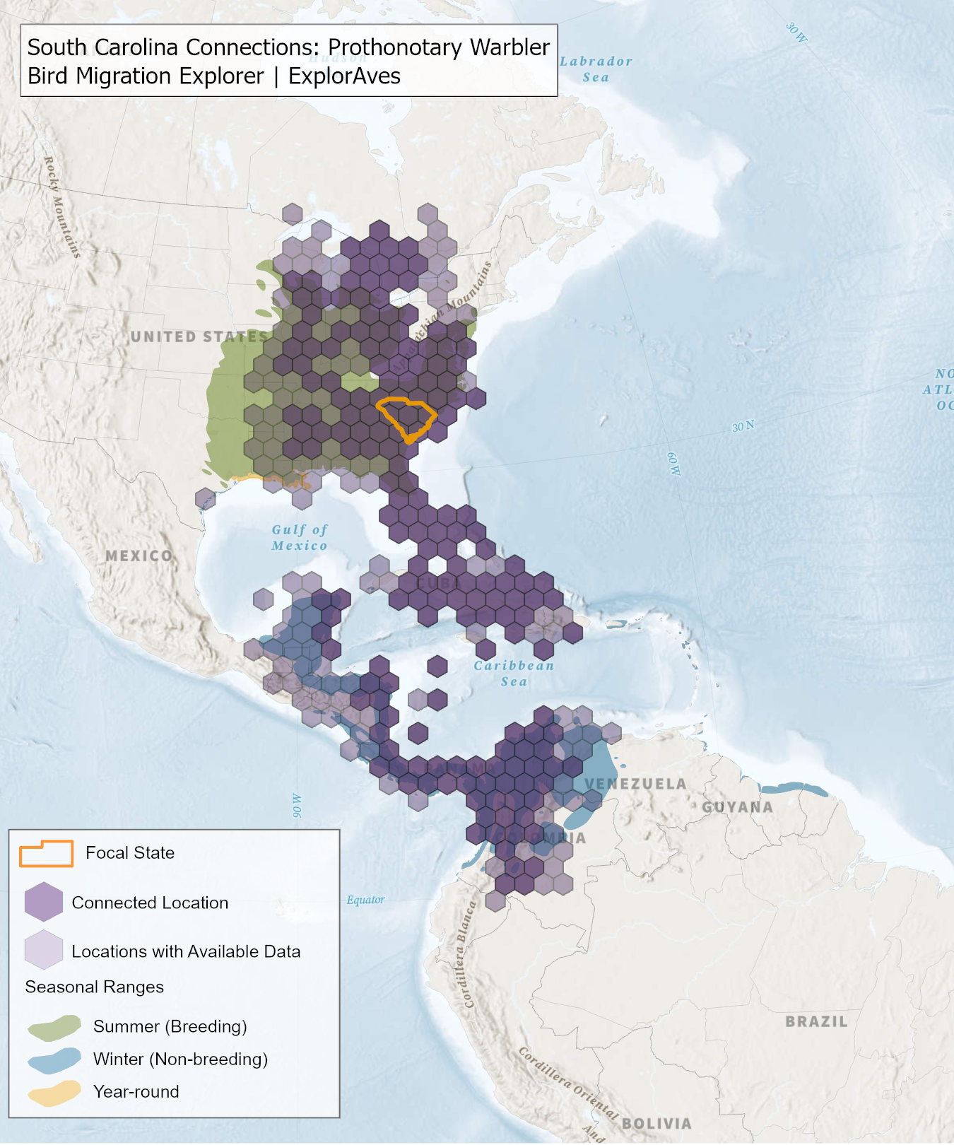 This map shows direct connections between South Carolina and locations across the hemisphere based on available tagging data for individual Prothonotary Warbler shared by researchers for the Bird Migration Explorer. Data were generously shared by researchers for the Bird Migration Explorer. The map displays the hexagons that are connected to the state (dark purple) as well as hexagons with available tagging data for the species (light purple) with no direct connections to the state.. Explore more connections for Prothonotary Warbler on the Download map.