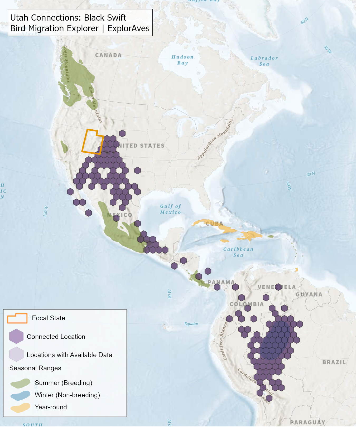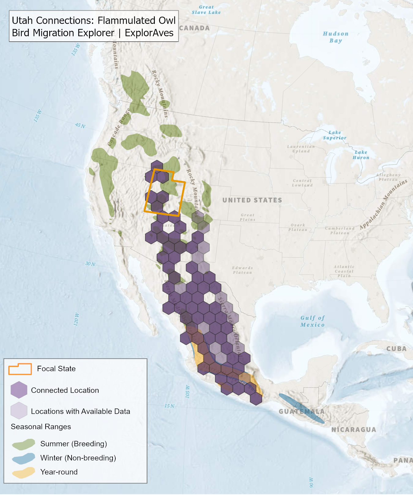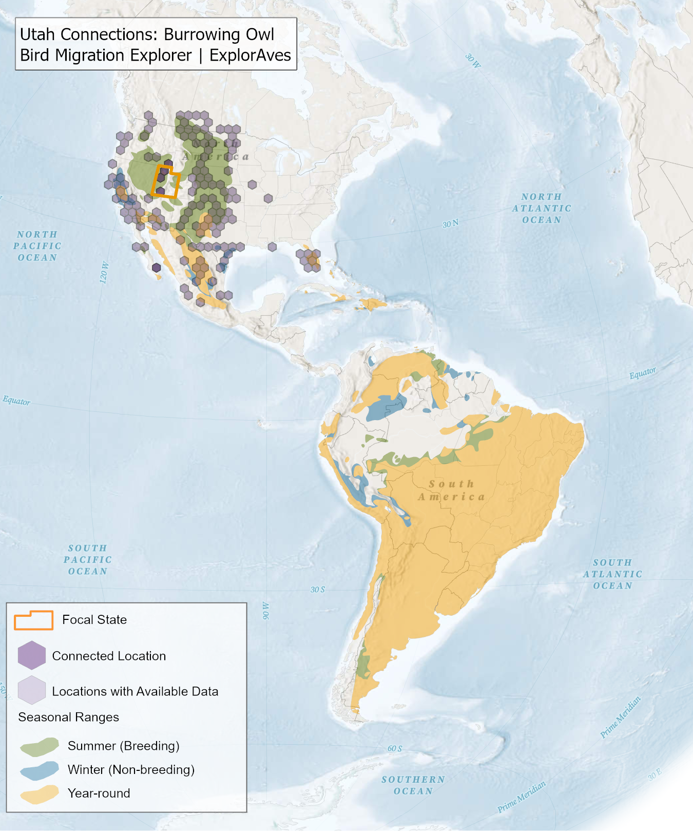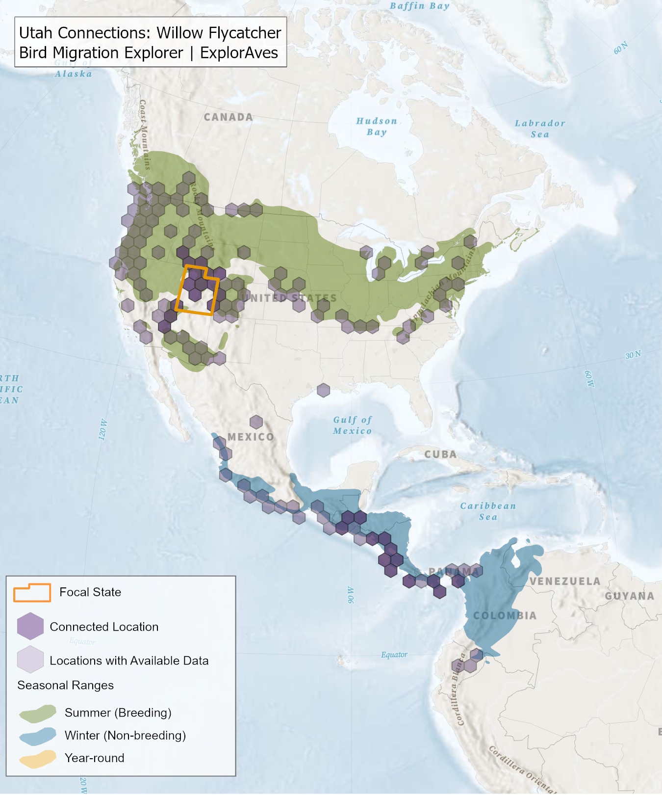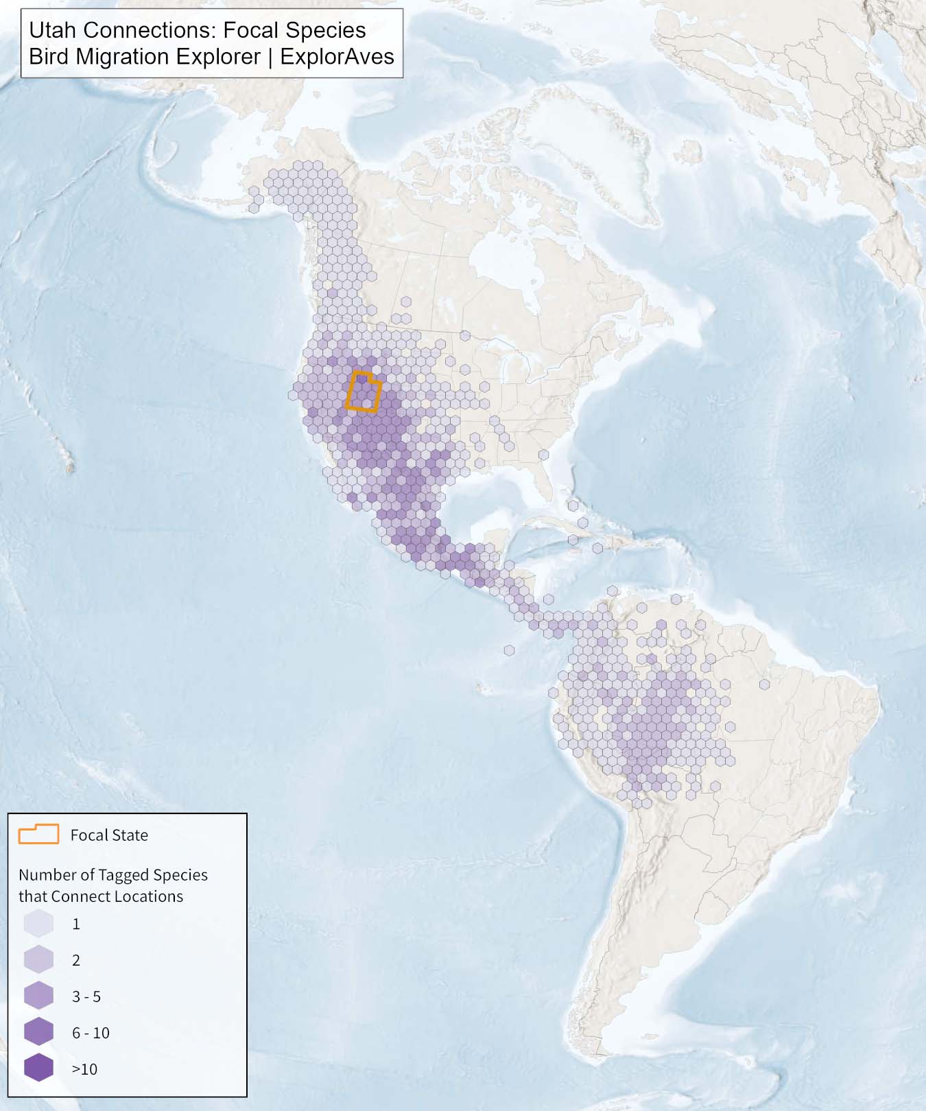 The species connection maps show direct connections between Utah and locations across the Western Hemisphere based on tagging data in the Bird Migration Explorer available for each of the state’s migratory species of concern. Connections are based on bird band encounter records, automated radio telemetry, archival geolocators, satellite and GPS tracking, or genetic markers that document the movement of individual birds. The maps display locations (i.e., hexagons) that are connected to Utah (polygon outlined orange) and illustrate the need to protect, restore, enhance and manage safe habitat in those areas to ensure species can satisfy their biological requirements across the full annual cycle. As individual birds travel between the species’ summer (breeding) and winter (stationary non-breeding) ranges, they traverse geopolitical boundaries, underscoring the need for collaborative and coordinated conservation efforts to maximize the return on conservation investments for the species in Utah. While these maps offer valuable insight, they do not capture the complete picture of all connections, because they only present tagging data available in the Bird Migration Explorer. In some cases, species may not have a connection map, because no tagging data are available.