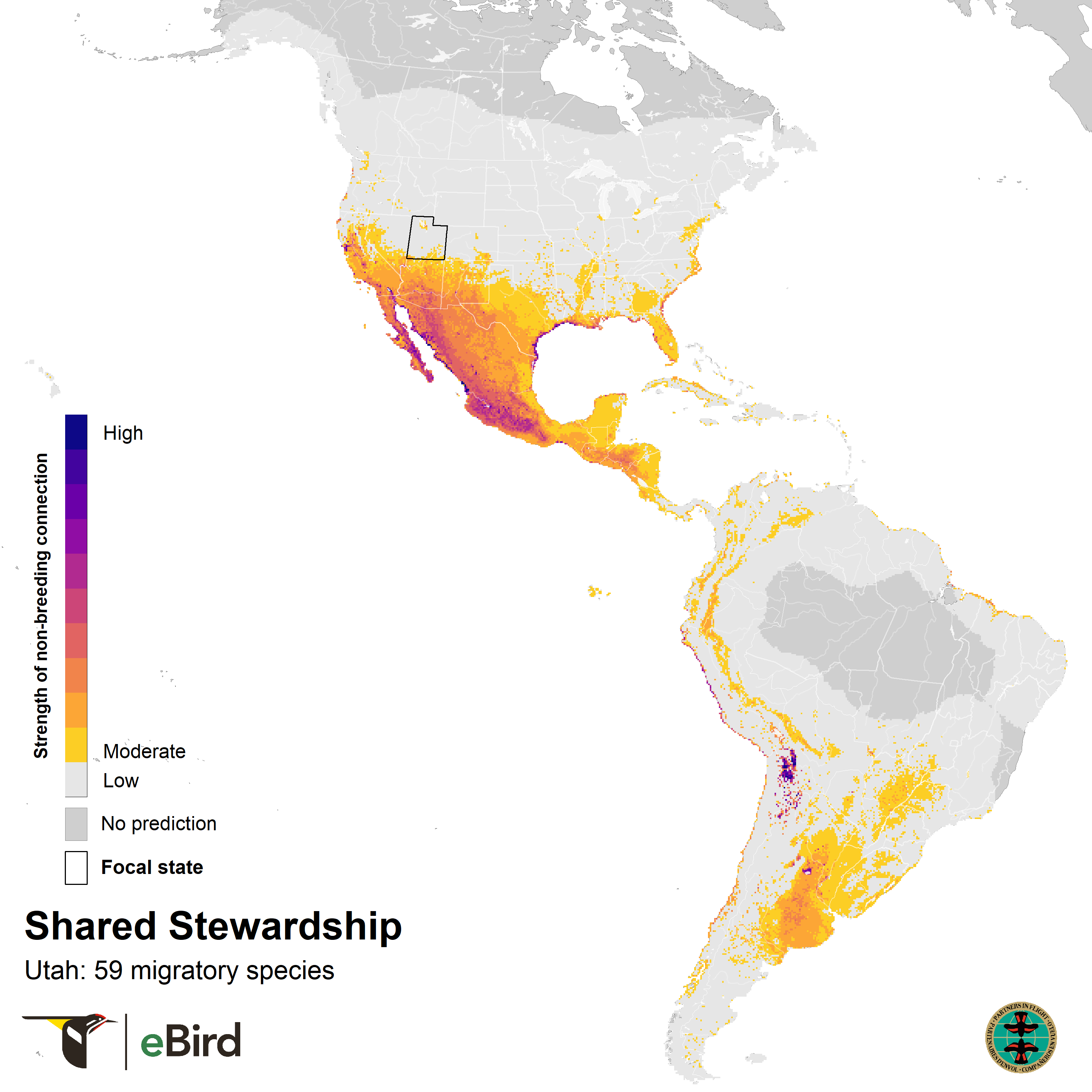 (1) A state-level overview of where the migratory birds that breed in Utah are found during the non-breeding season based on Shared Stewardship Connection Maps.