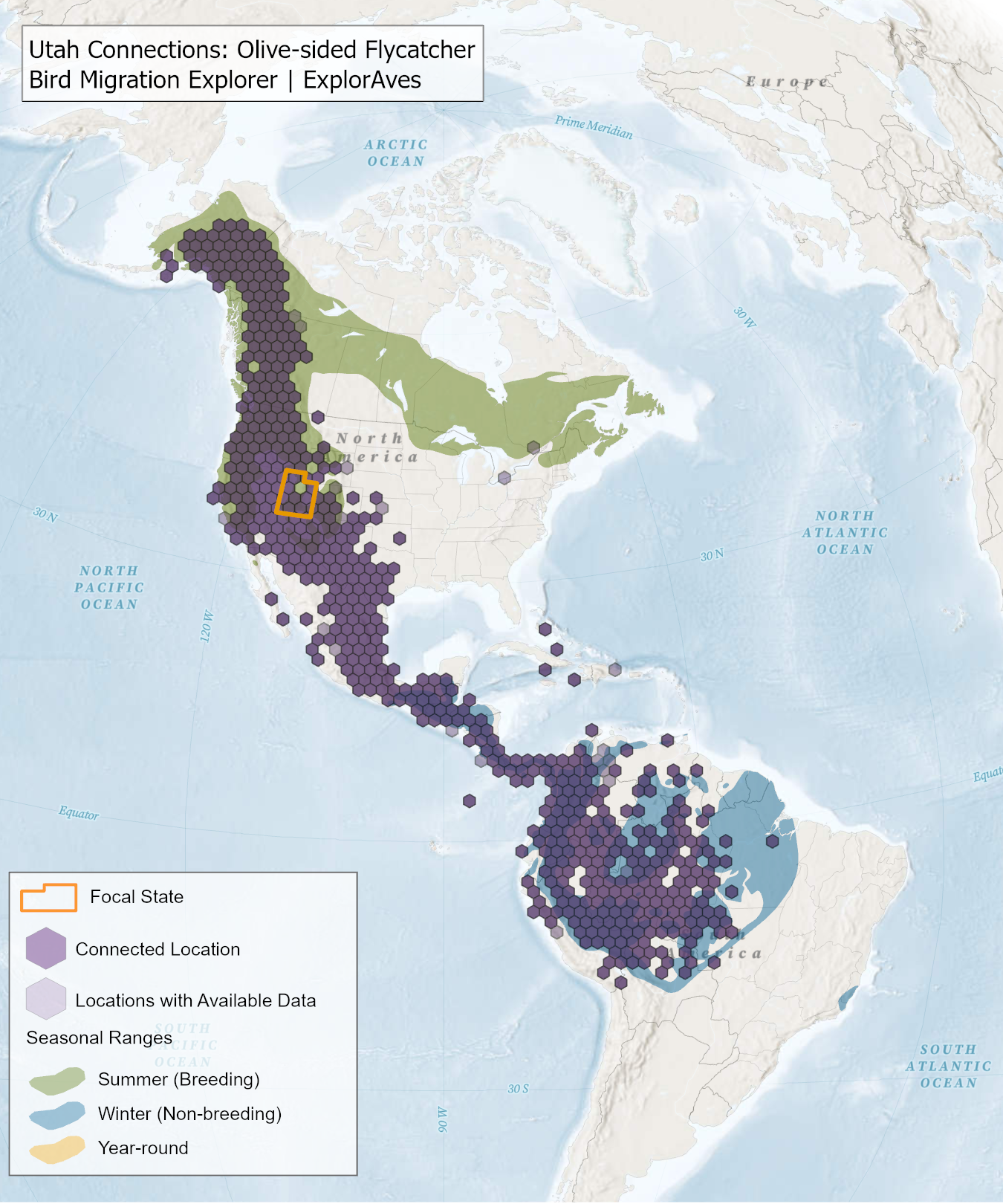 This map shows direct connections between Utah and locations across the hemisphere based on available tagging data for individual Olive-sided Flycatcher's shared by researchers for the Bird Migration Explorer. Data were generously shared by researchers for the Bird Migration Explorer. The map displays the hexagons that are connected to the state (dark purple) as well as hexagons with available tagging data for the species (light purple) with no direct connections to the state. Explore more connections for Olive-sided Flycatcher on the Bird Migration Explorer. Download map.