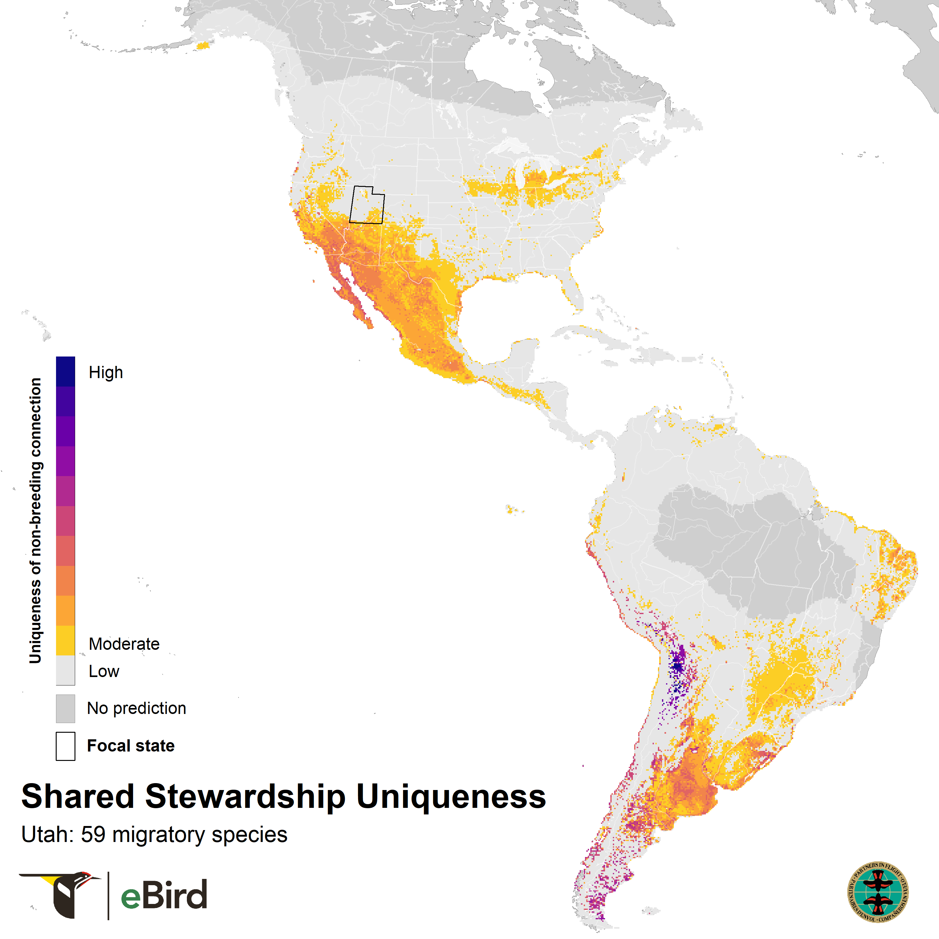 These maps show where 59 migratory species that breed in Utah are concentrated during the nonbreeding season using year-round distribution models from eBird Status and Trends. They highlight opportunities for conservation across the full annual cycle of birds by informing locations for joint stewardship actions. Shared stewardship, on the left, represents the strength of connection between Utah and the nonbreeding distributions of Utah's migratory birds. Shared stewardship uniqueness, on the right, shows this information relative to all 50 states, emphasizing the hotspots where Utah has unique connections compared to other states. The values in each 3 x 3 km pixel combine information on the number of species, the nonbreeding abundances of those species, and the percent of each species’ breeding population in Utah.