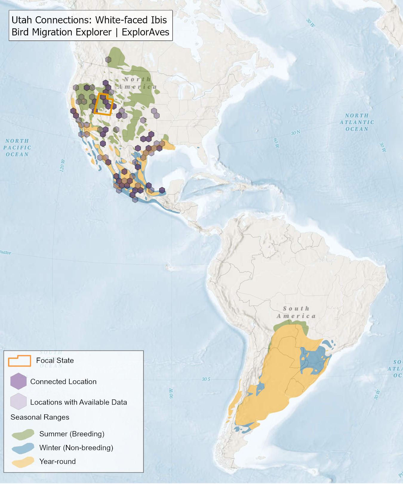 This map shows direct connections between Utah and locations across the hemisphere based on available tagging data for individual White-faced Ibis' shared by researchers for the Bird Migration Explorer. Data were generously shared by researchers for the Bird Migration Explorer. The map displays the hexagons that are connected to the state (dark purple) as well as hexagons with available tagging data for the species (light purple) with no direct connections to the state. Explore more connections for White-faced Ibis on the Bird Migration Explorer. Download map.