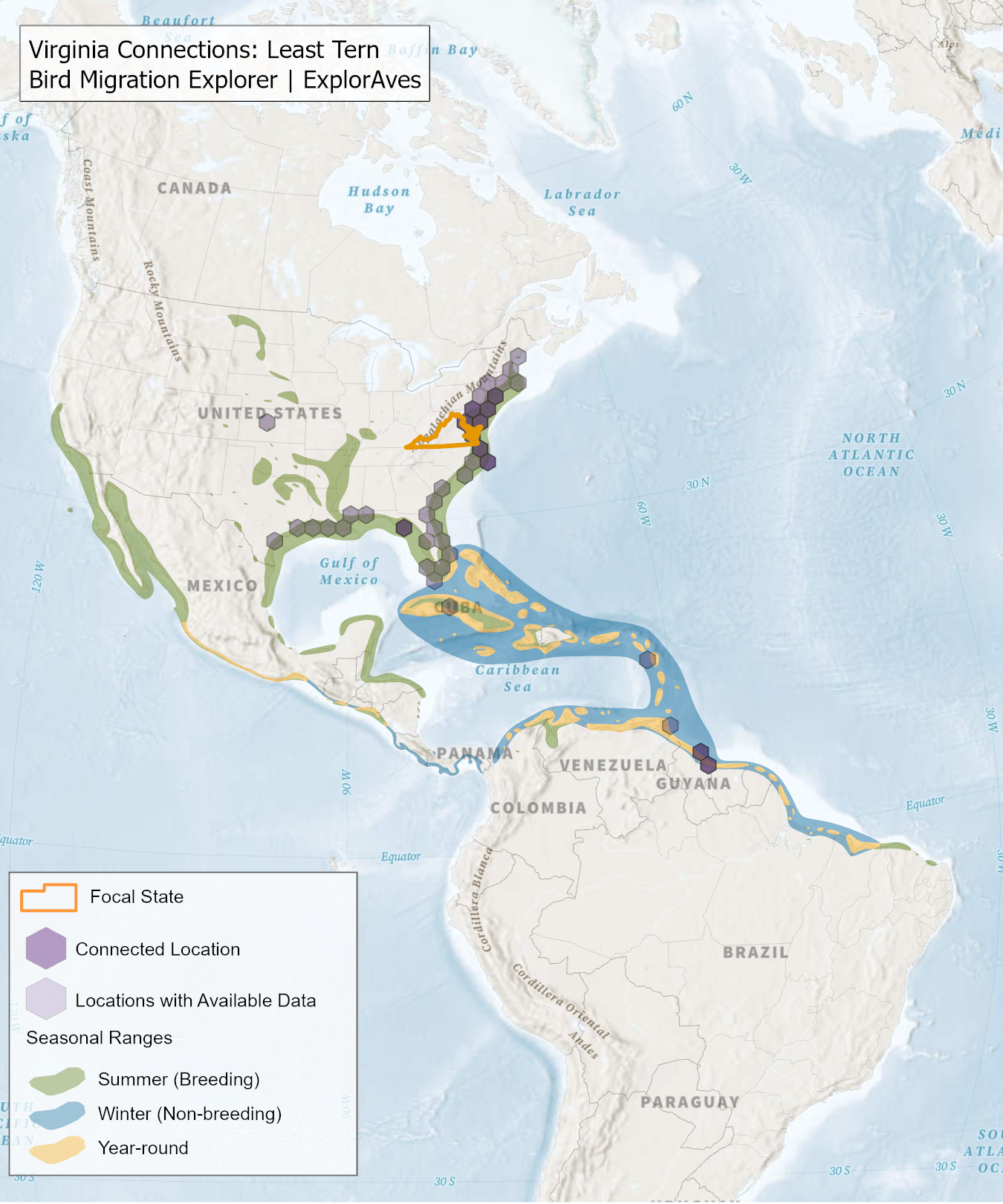 This map shows direct connections between Virginia and locations across the hemisphere based on available tagging data for individual Least Tern's shared by researchers for the Bird Migration Explorer. Data were generously shared by researchers for the Bird Migration Explorer. The map displays the hexagons that are connected to the state (dark purple) as well as hexagons with available tagging data for the species (light purple) with no direct connections to the state. Explore more connections for Least Tern on the Bird Migration Explorer. Download map.