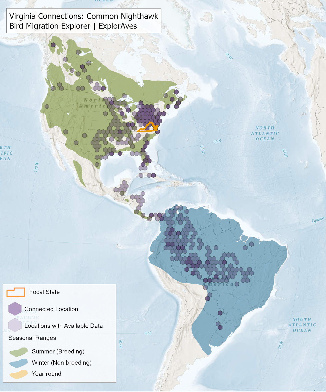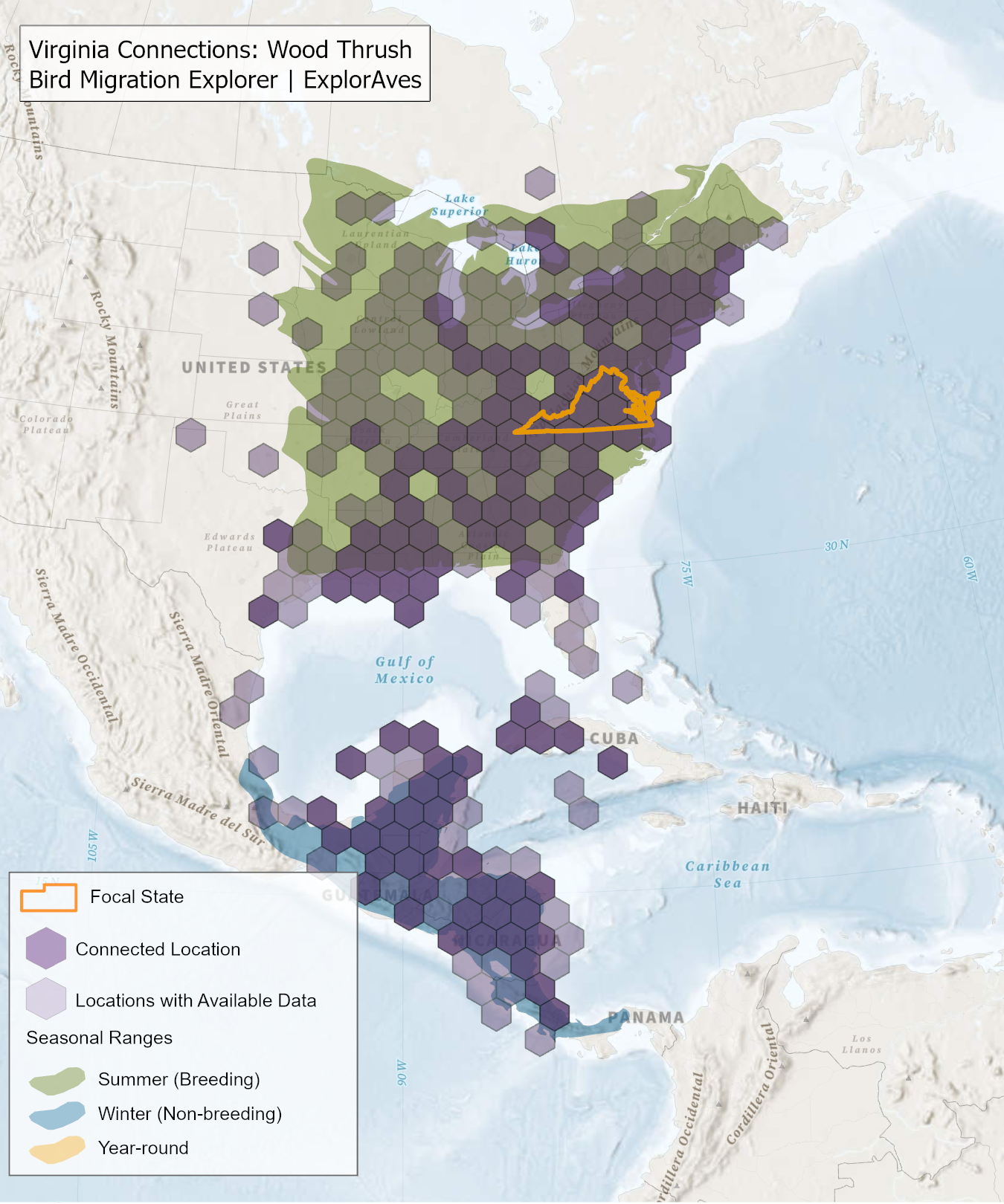 The species connection maps show direct connections between Virginia and locations across the Western Hemisphere based on tagging data in the Bird Migration Explorer available for each of the state’s migratory species of concern. Connections are based on bird band encounter records, automated radio telemetry, archival geolocators, satellite and GPS tracking, or genetic markers that document the movement of individual birds. The maps display locations (i.e., hexagons) that are connected to Virginia (polygon outlined orange) and illustrate the need to protect, restore, enhance and manage safe habitat in those areas to ensure species can satisfy their biological requirements across the full annual cycle. As individual birds travel between the species’ summer (breeding) and winter (stationary non-breeding) ranges, they traverse geopolitical boundaries, underscoring the need for collaborative and coordinated conservation efforts to maximize the return on conservation investments for the species in Virginia. While these maps offer valuable insight, they do not capture the complete picture of all connections, because they only present tagging data available in the Bird Migration Explorer. In some cases, species may not have a connection map, because no tagging data are available.
