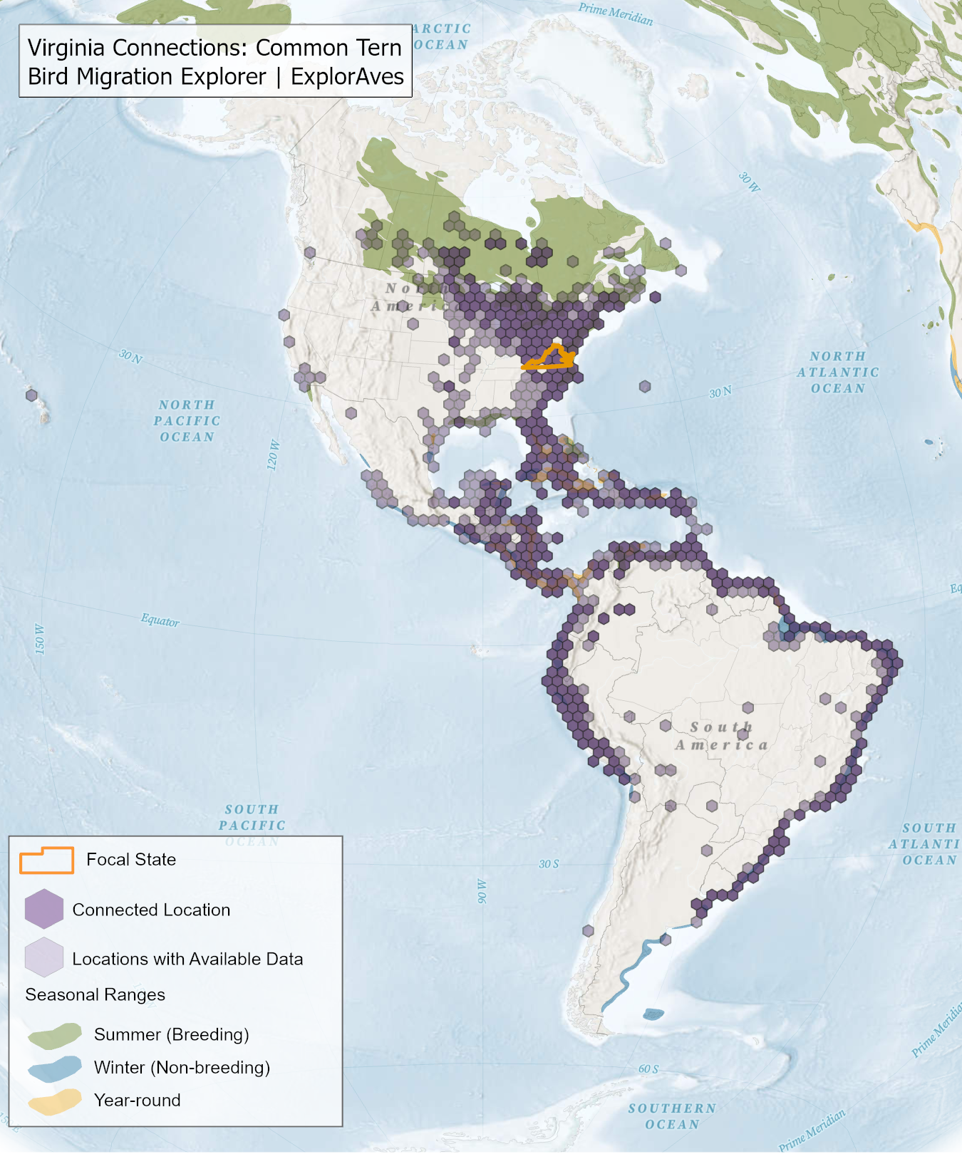This map shows direct connections between Virginia and locations across the hemisphere based on available tagging data for individual Common Tern's shared by researchers for the Bird Migration Explorer. Data were generously shared by researchers for the Bird Migration Explorer. The map displays the hexagons that are connected to the state (dark purple) as well as hexagons with available tagging data for the species (light purple) with no direct connections to the state. Explore more connections for Common Tern on the Bird Migration Explorer. Download map.