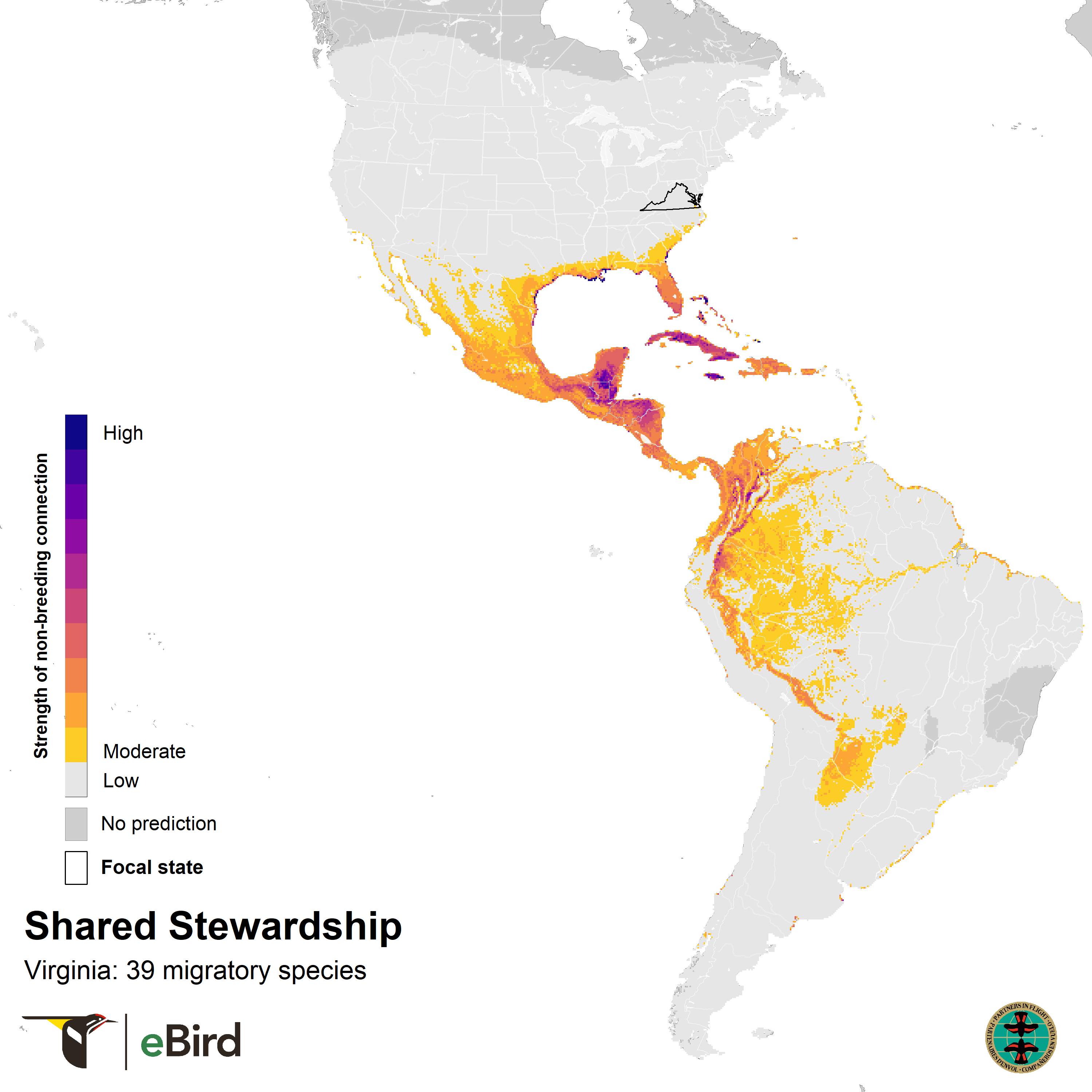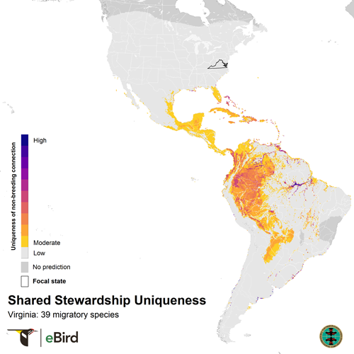 These maps show where 39 migratory species that breed in Virginia are concentrated during the nonbreeding season using year-round distribution models from eBird Status and Trends. They highlight opportunities for conservation across the full annual cycle of birds by informing locations for joint stewardship actions. Shared stewardship, on the left, represents the strength of connection between Virginia and the nonbreeding distributions of Virginia's migratory birds. Shared stewardship uniqueness, on the right, shows this information relative to all 50 states, emphasizing the hotspots where Virginia has unique connections compared to other states. The values in each 3 x 3 km pixel combine information on the number of species, the nonbreeding abundances of those species, and the percent of each species’ breeding population in Virginia.