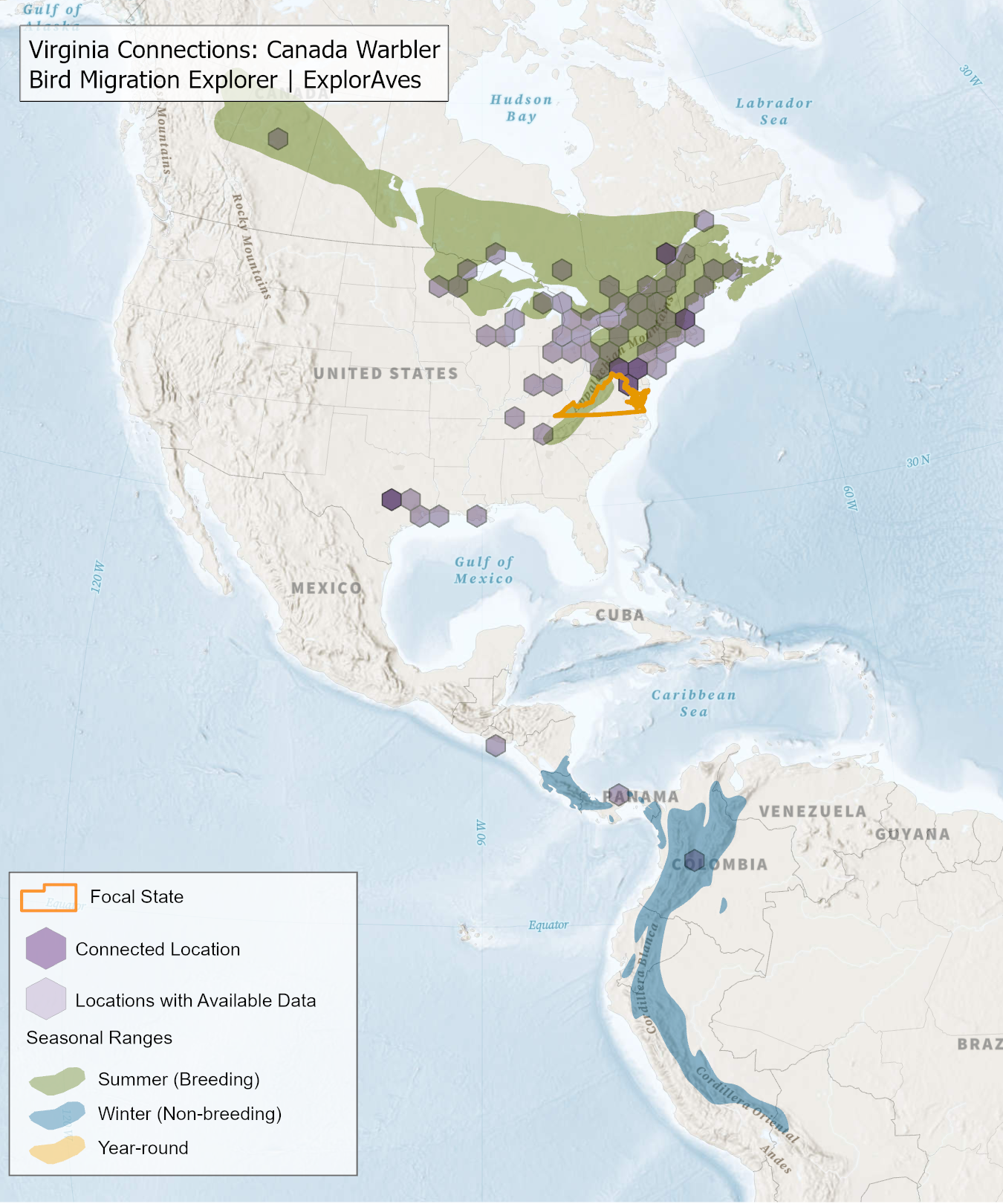 This map shows direct connections between Virginia and locations across the hemisphere based on available tagging data for individual Canada Warbler's shared by researchers for the Bird Migration Explorer. Data were generously shared by researchers for the Bird Migration Explorer. The map displays the hexagons that are connected to the state (dark purple) as well as hexagons with available tagging data for the species (light purple) with no direct connections to the state. Explore more connections for Canada Warbler on the Bird Migration Explorer. Download map.
