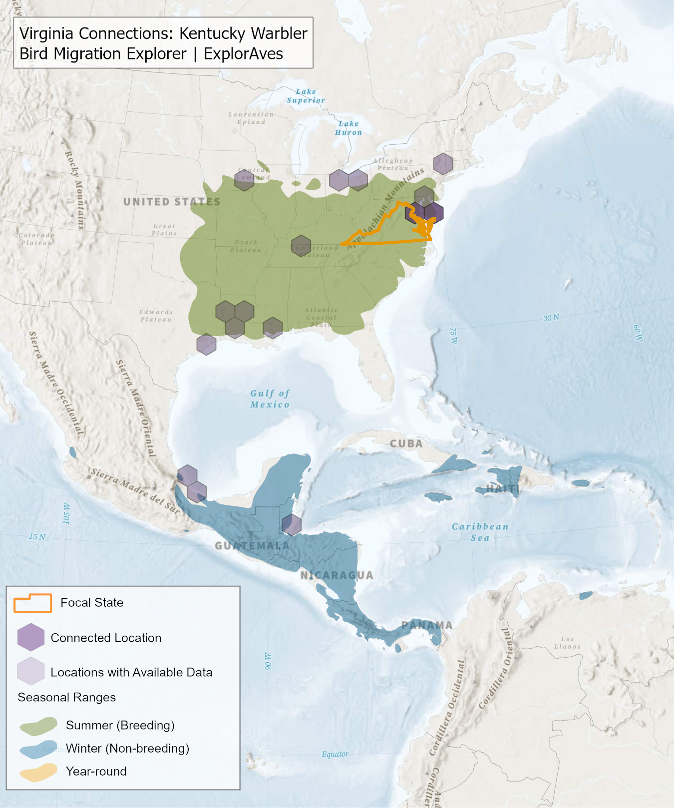 This map shows direct connections between Virginia and locations across the hemisphere based on available tagging data for individual Kentucky Warbler's shared by researchers for the Bird Migration Explorer. Data were generously shared by researchers for the Bird Migration Explorer. The map displays the hexagons that are connected to the state (dark purple) as well as hexagons with available tagging data for the species (light purple) with no direct connections to the state. Explore more connections for Kentucky Warbler on the Bird Migration Explorer. Download map.