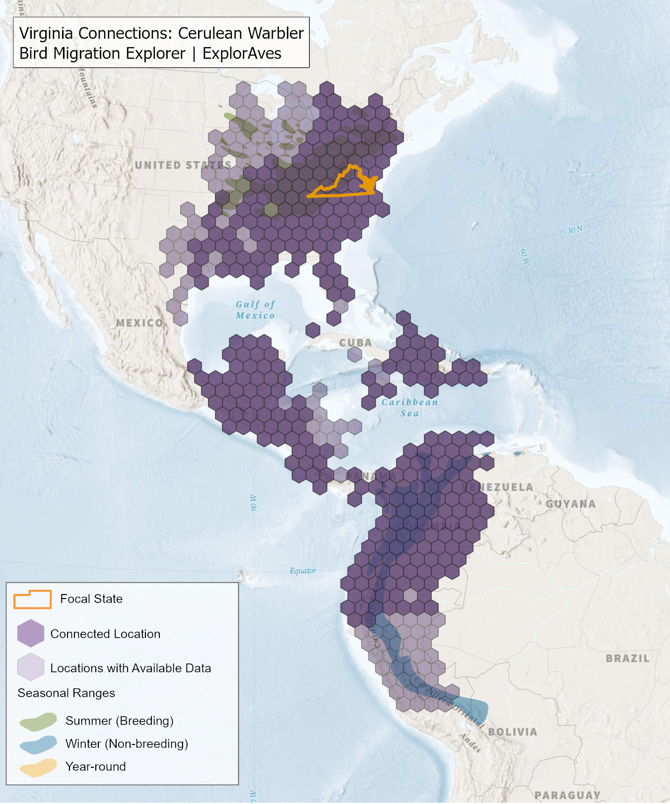 This map shows direct connections between Virginia and locations across the hemisphere based on available tagging data for individual Cerulean Warbler's shared by researchers for the Bird Migration Explorer. Data were generously shared by researchers for the Bird Migration Explorer. The map displays the hexagons that are connected to the state (dark purple) as well as hexagons with available tagging data for the species (light purple) with no direct connections to the state. Explore more connections for Cerulean Warbler on the Bird Migration Explorer. Download map.