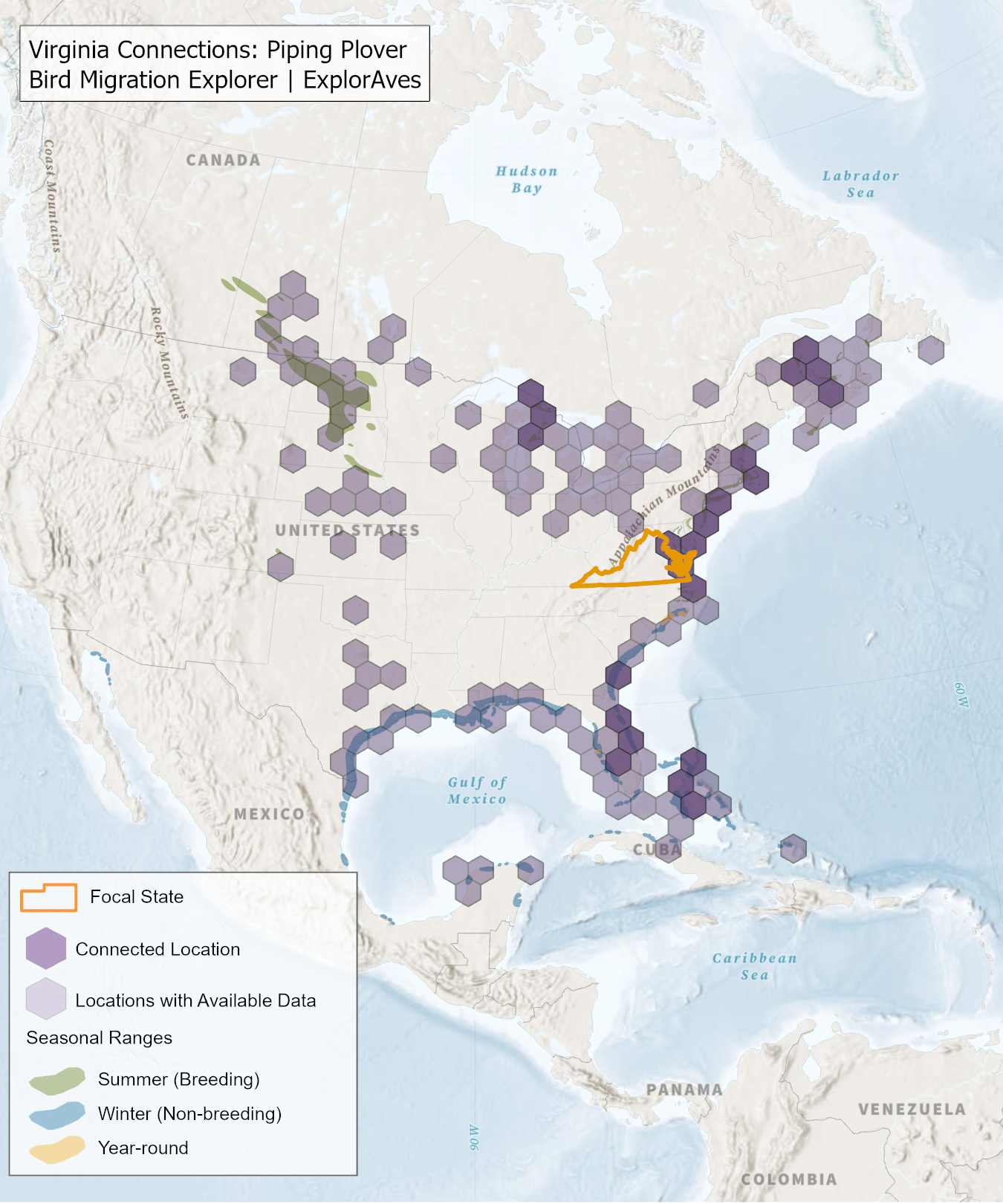 This map shows direct connections between Virginia and locations across the hemisphere based on available tagging data for individual Piping Plover's shared by researchers for the Bird Migration Explorer. Data were generously shared by researchers for the Bird Migration Explorer. The map displays the hexagons that are connected to the state (dark purple) as well as hexagons with available tagging data for the species (light purple) with no direct connections to the state.