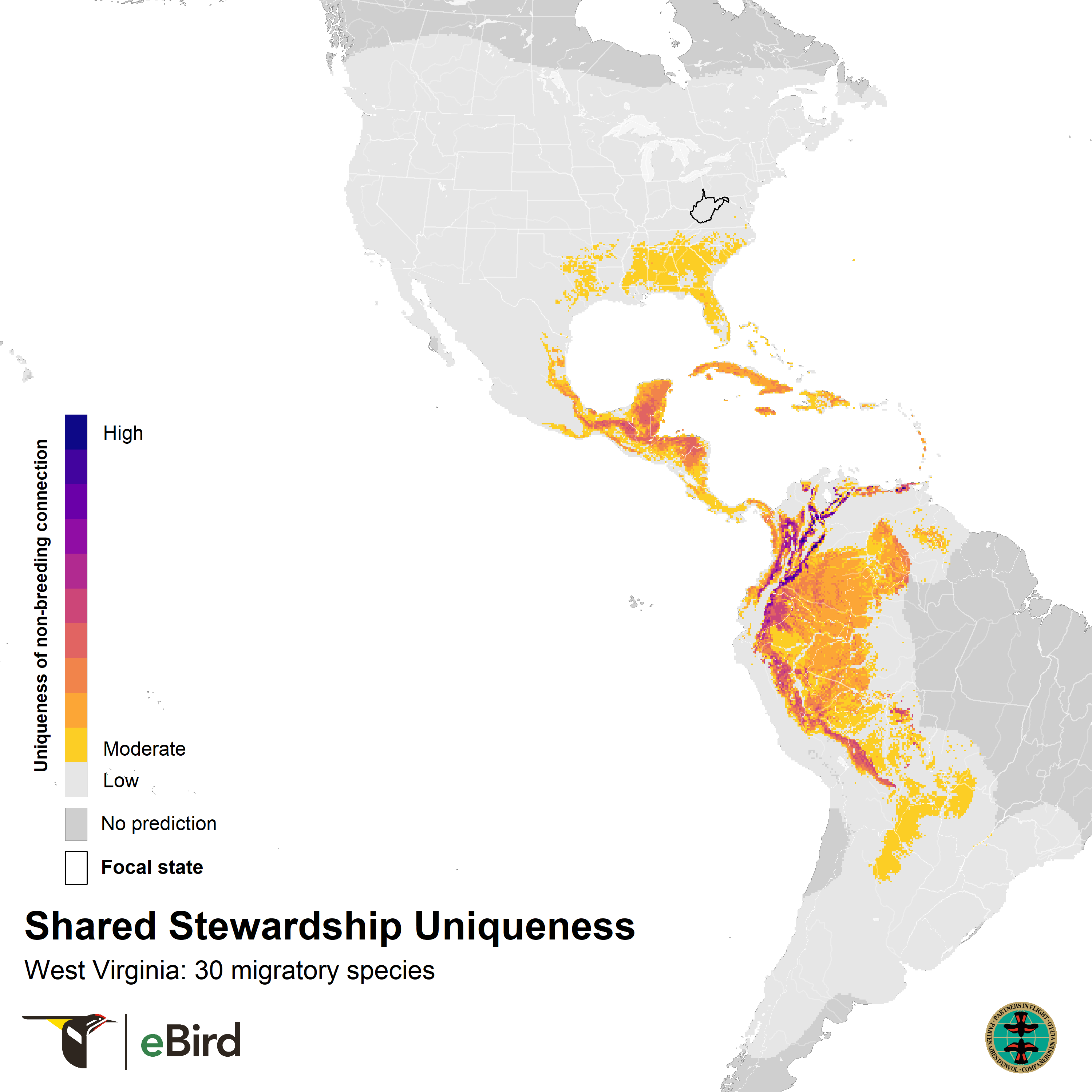 These maps show where 30 migratory species that breed in West Virginia are concentrated during the nonbreeding season using year-round distribution models from eBird Status and Trends. They highlight opportunities for conservation across the full annual cycle of birds by informing locations for joint stewardship actions. Shared stewardship, on the left, represents the strength of connection between West Virginia and the nonbreeding distributions of West Virginia's migratory birds. Shared stewardship uniqueness, on the right, shows this information relative to all 50 states, emphasizing the hotspots where West Virginia has unique connections compared to other states. The values in each 3 x 3 km pixel combine information on the number of species, the nonbreeding abundances of those species, and the percent of each species’ breeding population in West Virginia.