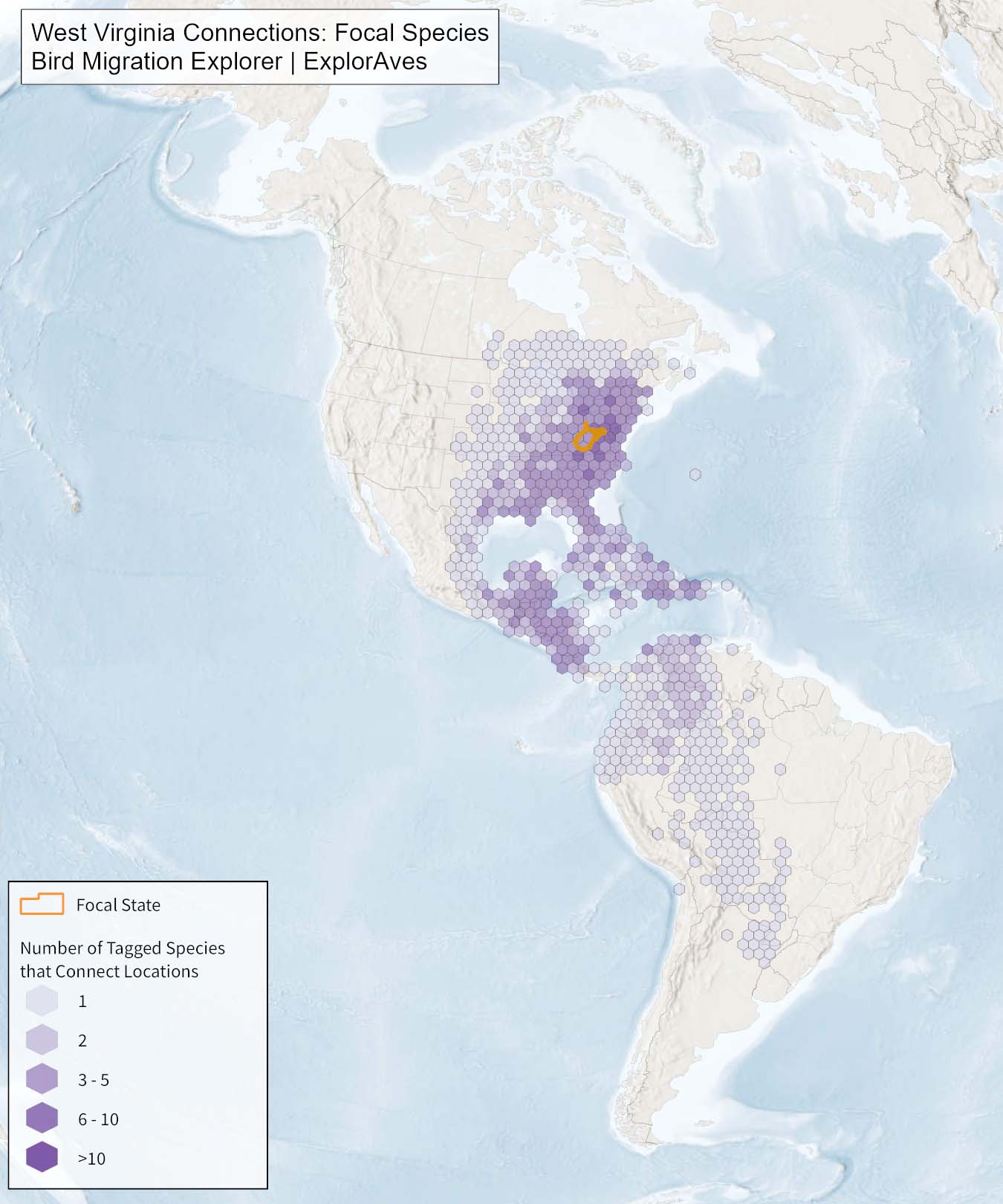 This map shows direct connections between West Virginia and other locations across the Western Hemisphere based on tagging data available in the Bird Migration Explorer for the state’s migratory focal species. Connections are based on bird band encounter records, automated radio telemetry, archival geolocators, satellite and GPS tracking, or genetic markers that document the movement of individual birds. The map displays the number of migratory focal species that connect each location (hexagon) to West Virginia. While these data offer valuable insight, they do not capture the complete picture of all connections because they only present available tagging data for the subset of species of concern identified by each state. The multi-species tagging connections map illustrates the need to protect, restore, enhance and manage safe habitat in locations connected to the state to ensure migratory species can access the resources they need across the full annual cycle. As individual birds travel between species’ summer (breeding) and winter (stationary non-breeding) ranges, they traverse geopolitical boundaries, underscoring the need for coordinated conservation efforts to maximize the return on conservation investments in West Virginia. Additionally, multi-species connection maps illustrate West Virginia's crucial role in safeguarding the migratory movements of these species.