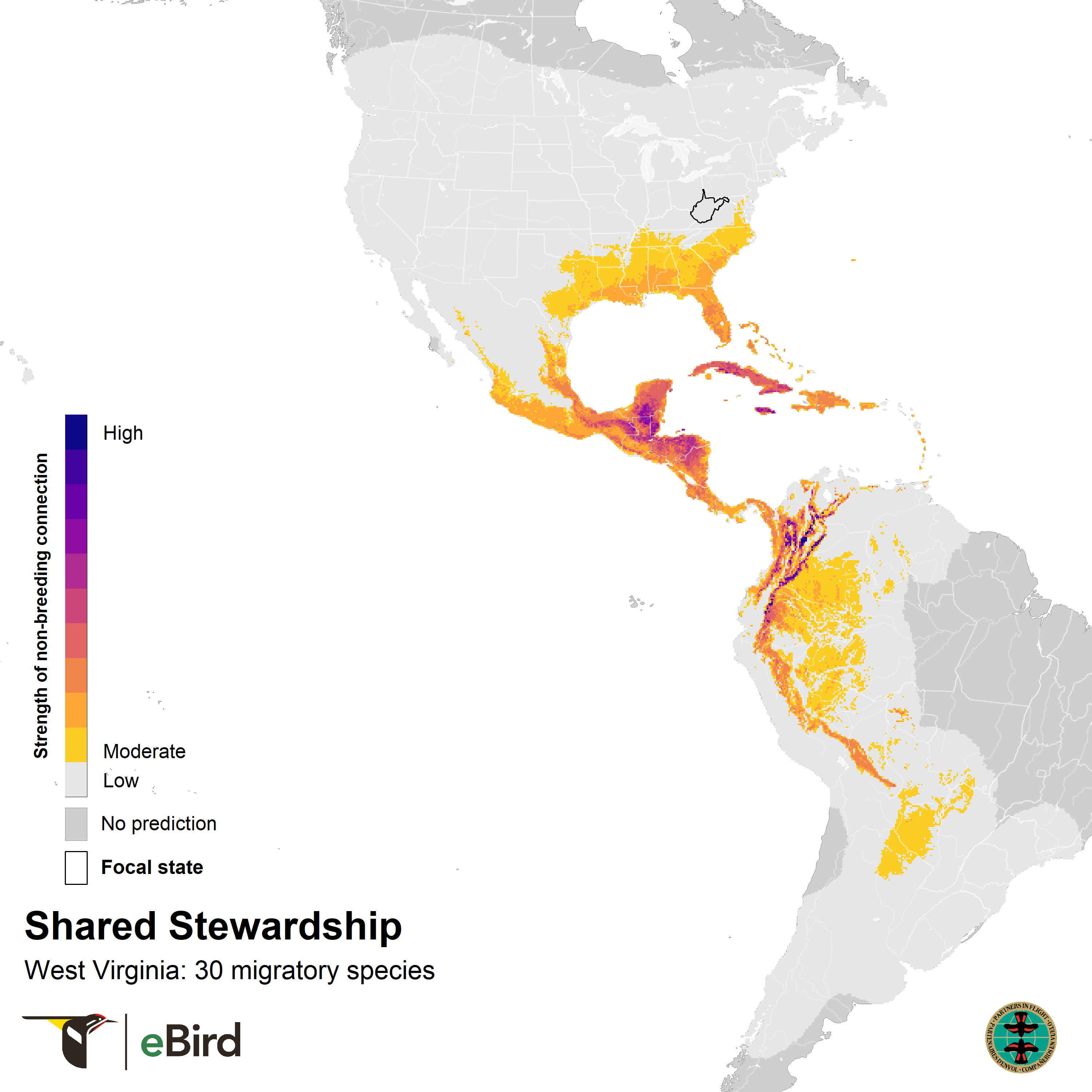(1) A state-level overview of where the migratory birds that breed in West Virginia are found during the non-breeding season based on Shared Stewardship Connection Maps.