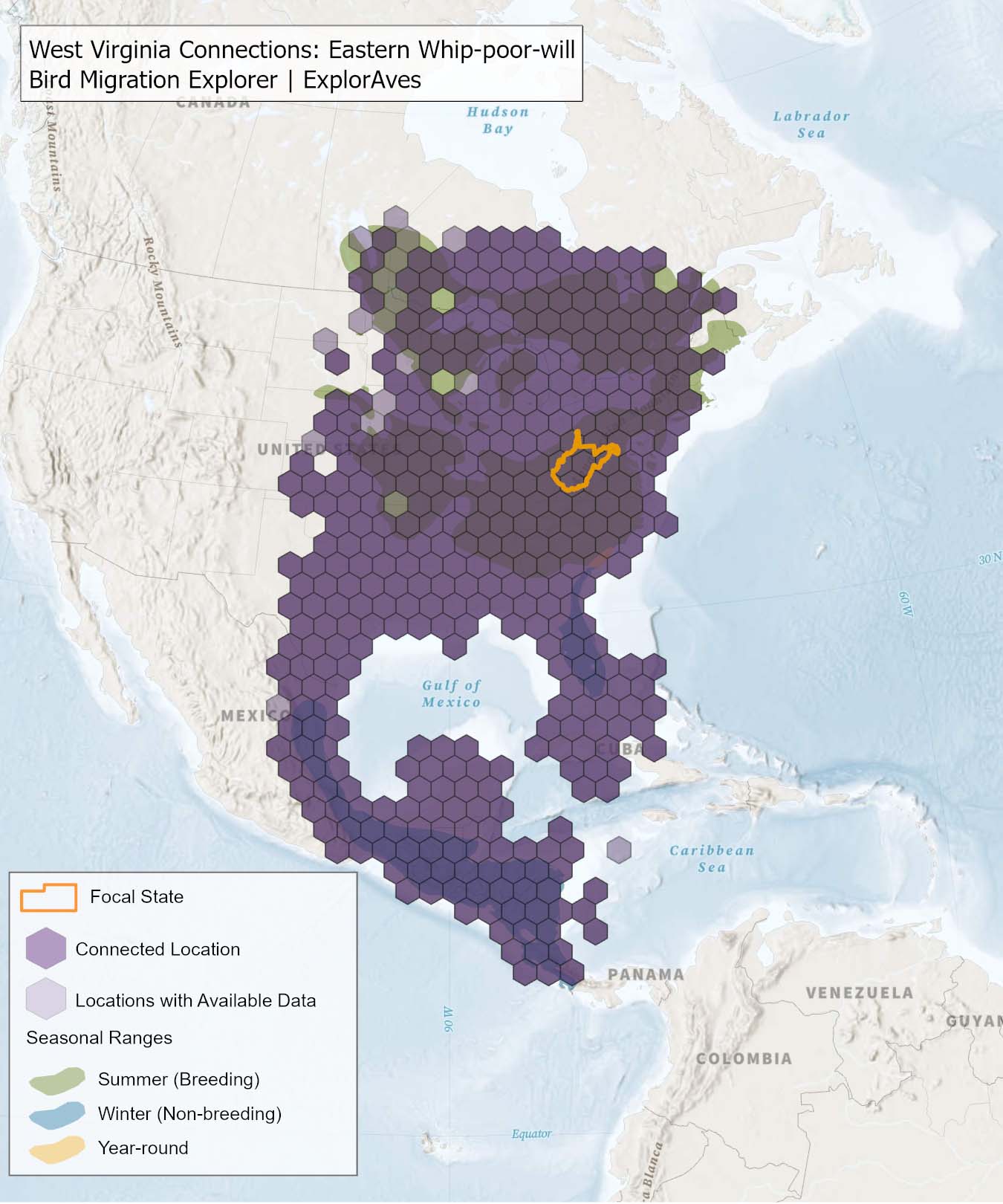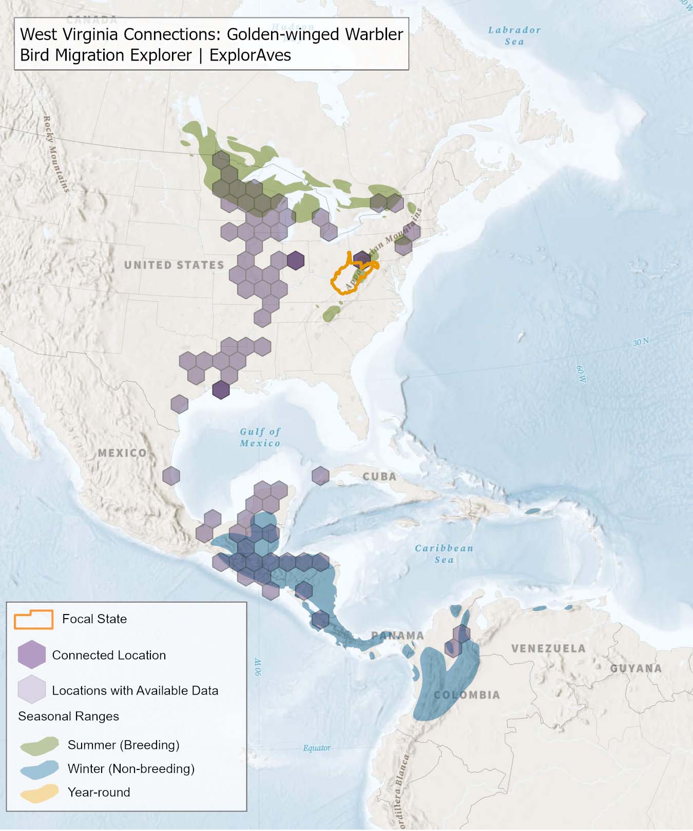 The species connection maps show direct connections between West Virginia and locations across the Western Hemisphere based on tagging data in the Bird Migration Explorer available for each of the state’s migratory species of concern. Connections are based on bird band encounter records, automated radio telemetry, archival geolocators, satellite and GPS tracking, or genetic markers that document the movement of individual birds. The maps display locations (i.e., hexagons) that are connected to West Virginia (polygon outlined orange) and illustrate the need to protect, restore, enhance and manage safe habitat in those areas to ensure species can satisfy their biological requirements across the full annual cycle. As individual birds travel between the species’ summer (breeding) and winter (stationary non-breeding) ranges, they traverse geopolitical boundaries, underscoring the need for collaborative and coordinated conservation efforts to maximize the return on conservation investments for the species in West Virginia. While these maps offer valuable insight, they do not capture the complete picture of all connections, because they only present tagging data available in the Bird Migration Explorer. In some cases, species may not have a connection map, because no tagging data are available.