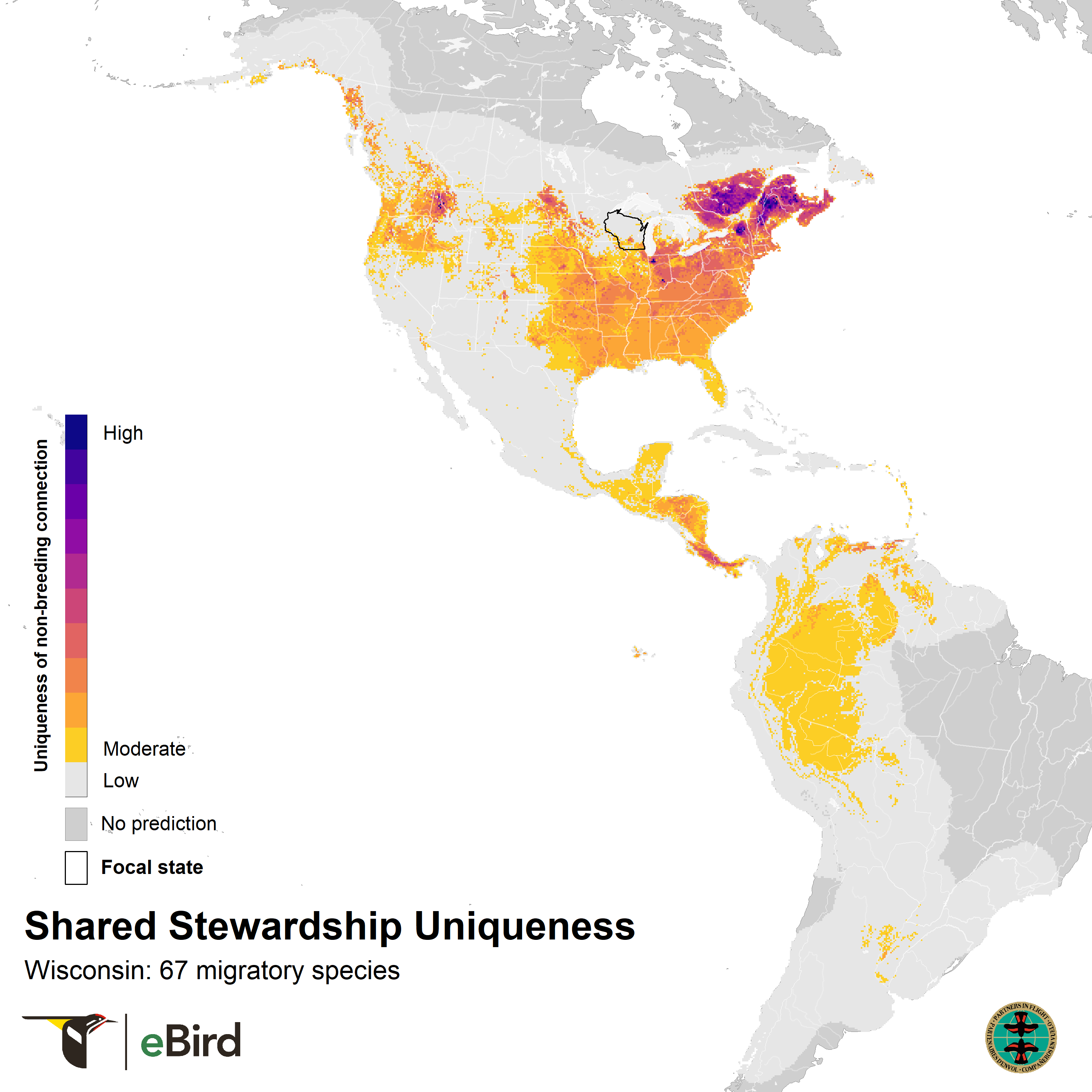 These maps used modeled information on the relative abundance and percent of population of bird species from eBird Status and Trends. Shared Stewardship maps are weighted sums of species’ nonbreeding populations at 3 x 3 km resolution, with the percentage of a species’ breeding population in Wisconsin state as the weight. Thus, if a species has a higher percent breeding population in a state, its nonbreeding map will contribute more to that state’s shared stewardship. Shared stewardship uniqueness maps show these values relative to the total connections across all 50 U.S.A. states by calculating the proportion of the total connection strength attributed to Wisconsin in each pixel. Download the complete list of species included in this map. For more information visit FAQs and eBird’s portal for state-level summaries.