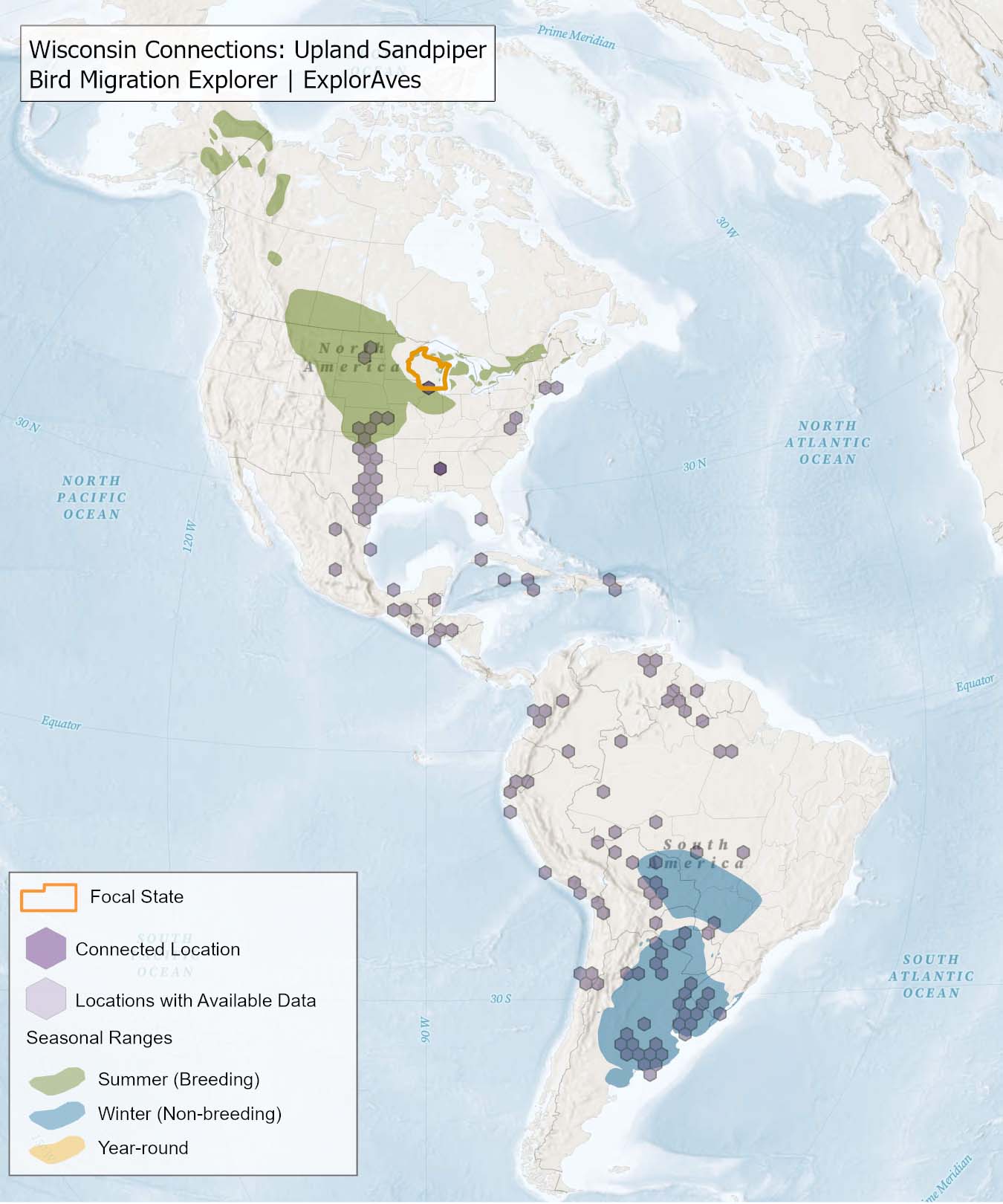 This map shows direct connections between Wisconsin and locations across the hemisphere based on available tagging data for individual Upland Sandpiper's shared by researchers for the Bird Migration Explorer. Data were generously shared by researchers for the Bird Migration Explorer. The map displays the hexagons that are connected to the state (dark purple) as well as hexagons with available tagging data for the species (light purple) with no direct connections to the state. Explore more connections for Upland Sandpiper on the Bird Migration Explorer. Download map.