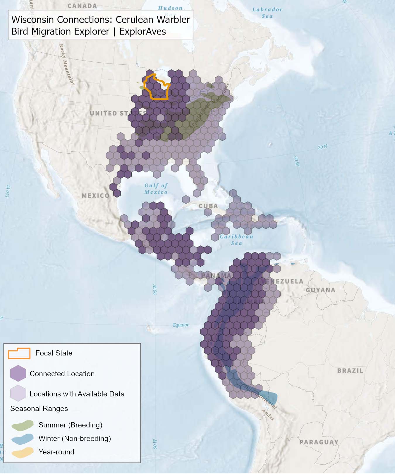 This map shows direct connections between Wisconsin and locations across the hemisphere based on available tagging data for individual Cerulean Warbler's shared by researchers for the Bird Migration Explorer. Data were generously shared by researchers for the Bird Migration Explorer. The map displays the hexagons that are connected to the state (dark purple) as well as hexagons with available tagging data for the species (light purple) with no direct connections to the state. Explore more connections for Cerulean Warbler on the Bird Migration Explorer. Download map.