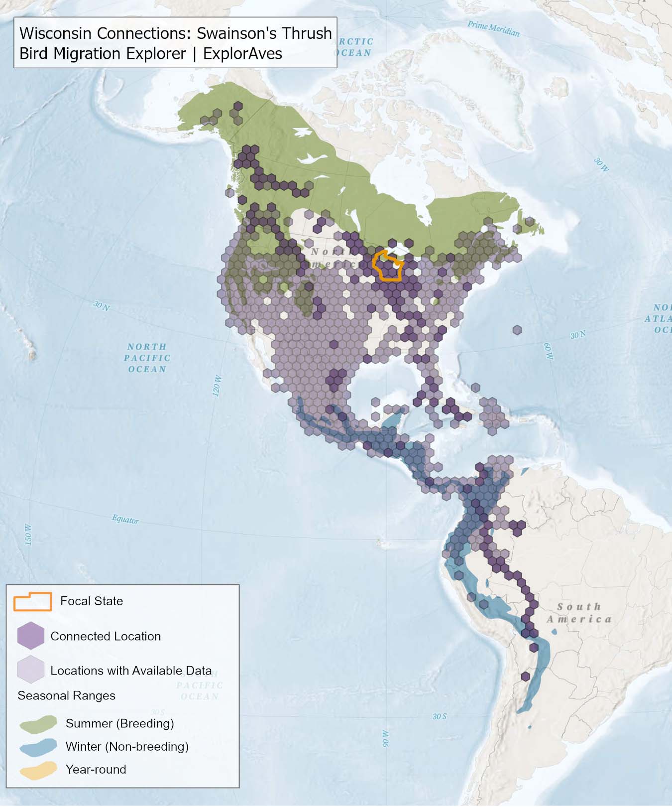 This map shows direct connections between Wisconsin and locations across the hemisphere based on available tagging data for individual Swainson's Thrush's shared by researchers for the Bird Migration Explorer. Data were generously shared by researchers for the Bird Migration Explorer. The map displays the hexagons that are connected to the state (dark purple) as well as hexagons with available tagging data for the species (light purple) with no direct connections to the state. Explore more connections for Swainson's Thrush on the Bird Migration Explorer. Download map.
