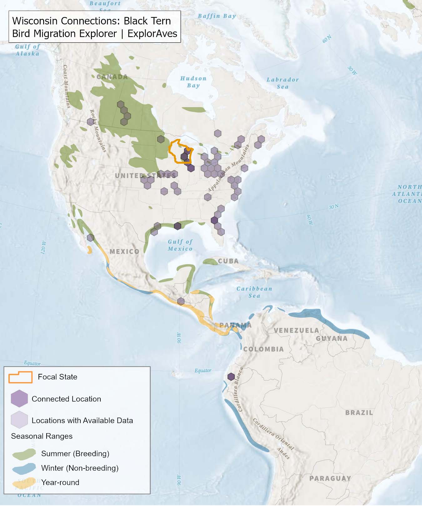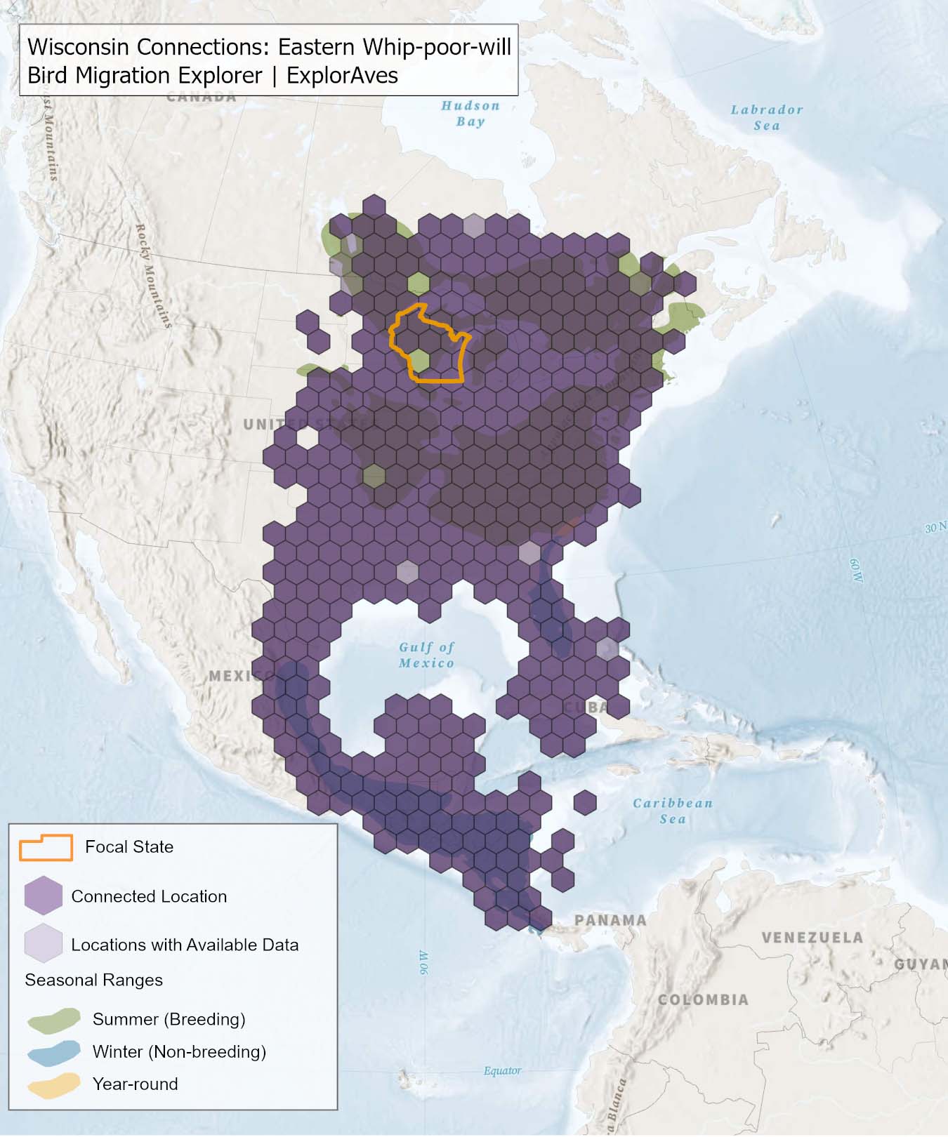 The species connection maps show direct connections between Wisconsin and locations across the Western Hemisphere based on tagging data in the Bird Migration Explorer available for each of the state’s migratory species of concern. Connections are based on bird band encounter records, automated radio telemetry, archival geolocators, satellite and GPS tracking, or genetic markers that document the movement of individual birds. The maps display locations (i.e., hexagons) that are connected to Wisconsin (polygon outlined orange) and illustrate the need to protect, restore, enhance and manage safe habitat in those areas to ensure species can satisfy their biological requirements across the full annual cycle. As individual birds travel between the species’ summer (breeding) and winter (stationary non-breeding) ranges, they traverse geopolitical boundaries, underscoring the need for collaborative and coordinated conservation efforts to maximize the return on conservation investments for the species in Wisconsin. While these maps offer valuable insight, they do not capture the complete picture of all connections, because they only present tagging data available in the Bird Migration Explorer. In some cases, species may not have a connection map, because no tagging data are available.