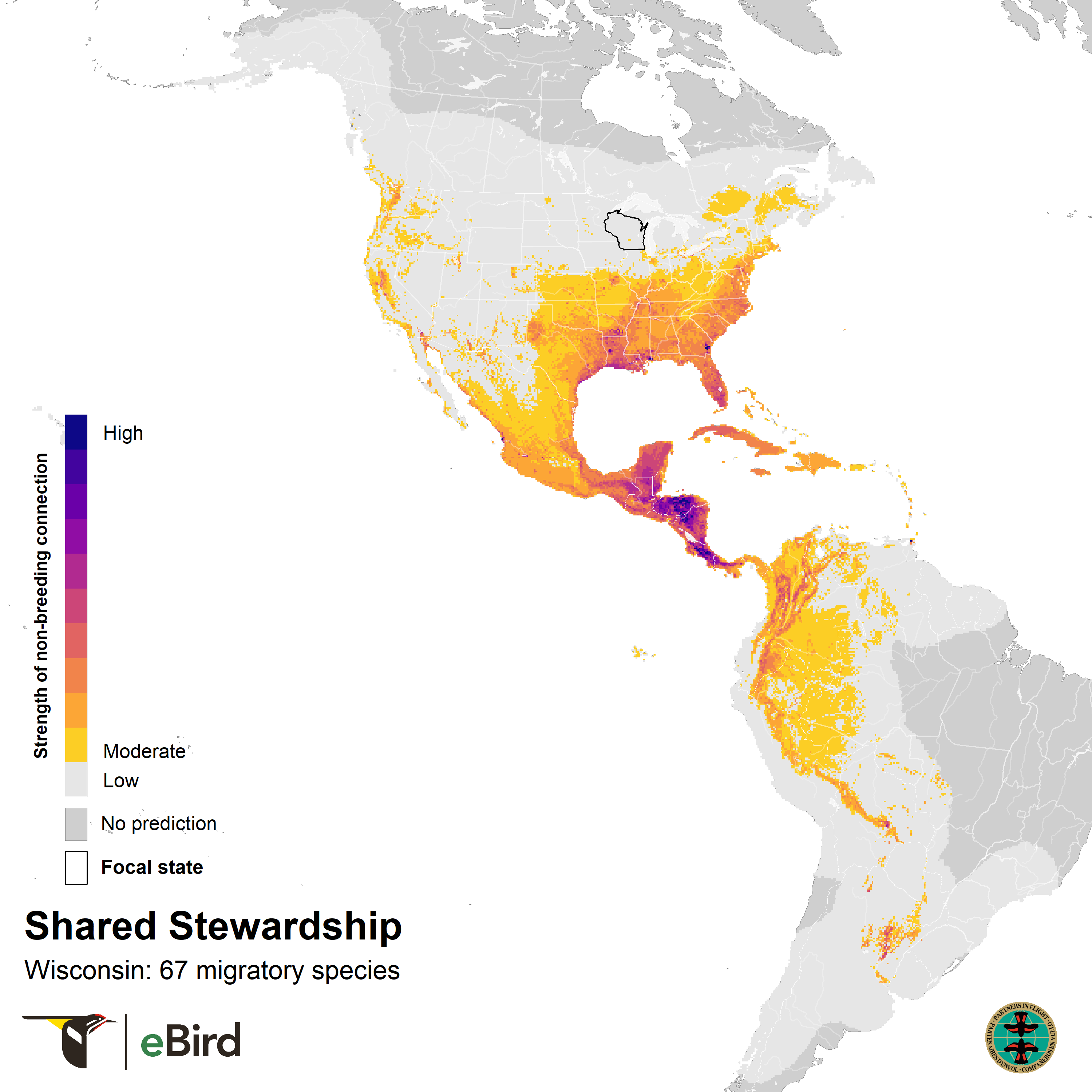(1) A state-level overview of where the migratory birds that breed in Wisconsin are found during the non-breeding season based on Shared Stewardship Connection Maps.