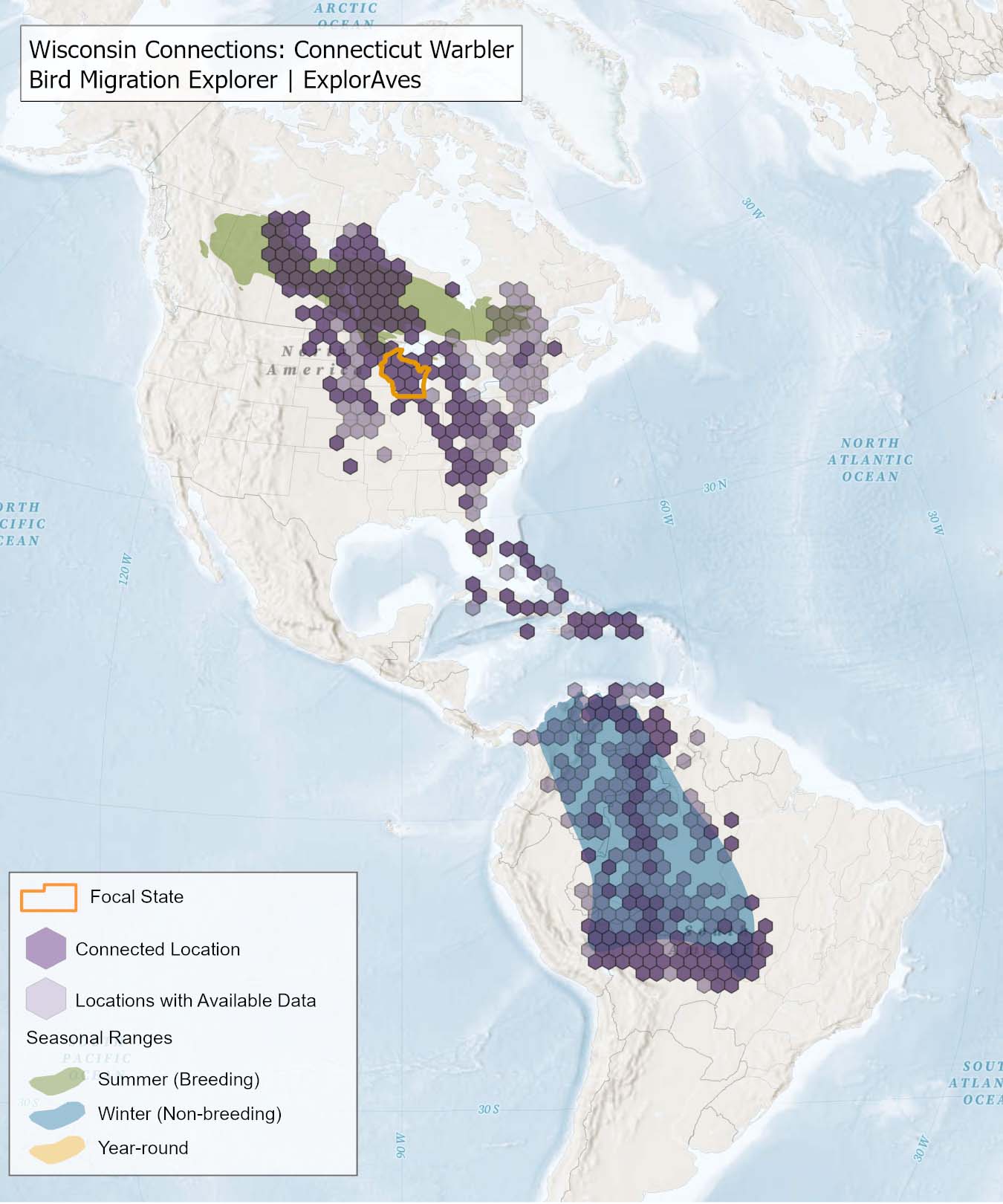 This map shows direct connections between Wisconsin and locations across the hemisphere based on available tagging data for individual Connecticut Warbler's shared by researchers for the Bird Migration Explorer. Data were generously shared by researchers for the Bird Migration Explorer. The map displays the hexagons that are connected to the state (dark purple) as well as hexagons with available tagging data for the species (light purple) with no direct connections to the state. Explore more connections for Connecticut Warbler on the Bird Migration Explorer. Download map.