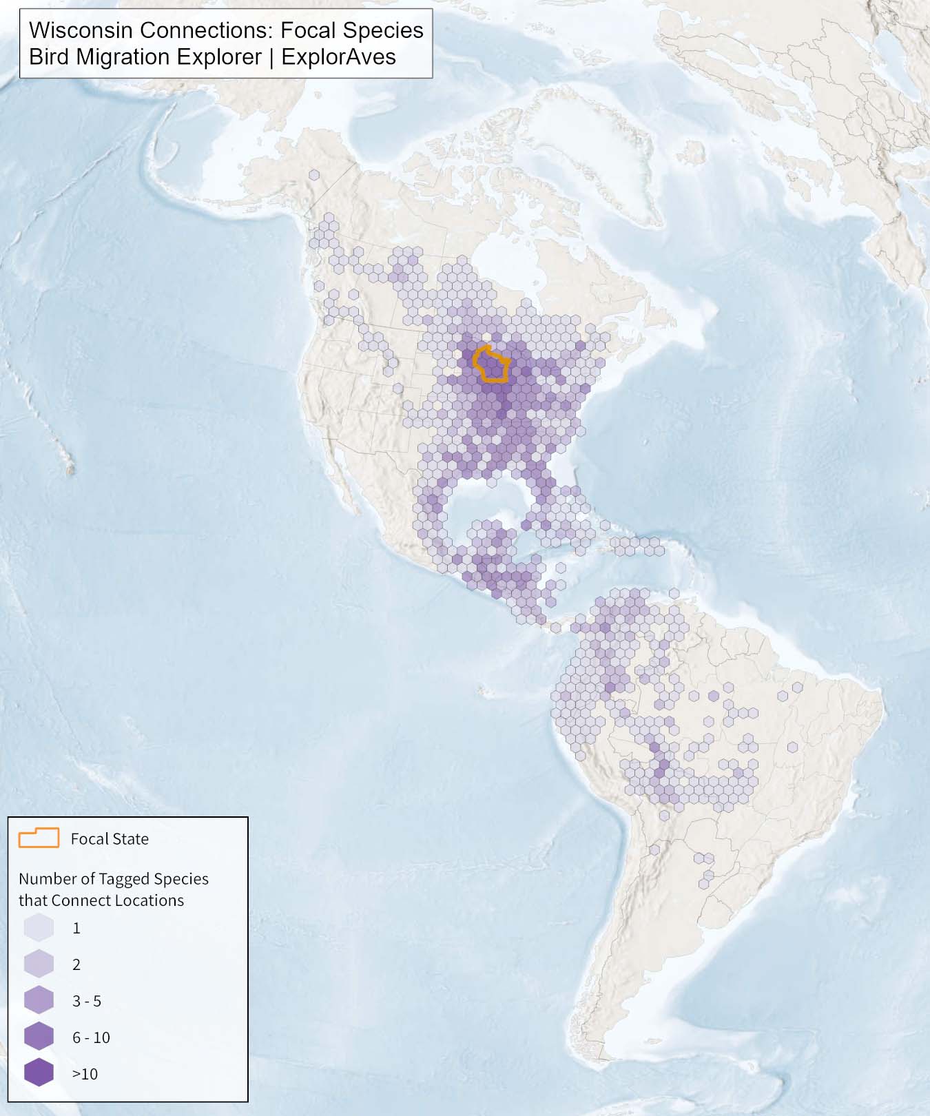 This map shows direct connections between Wisconsin and other locations across the Western Hemisphere based on tagging data available in the Bird Migration Explorer for the state’s migratory focal species. Connections are based on bird band encounter records, automated radio telemetry, archival geolocators, satellite and GPS tracking, or genetic markers that document the movement of individual birds. The map displays the number of migratory focal species that connect each location (hexagon) to Wisconsin. While these data offer valuable insight, they do not capture the complete picture of all connections because they only present available tagging data for the subset of species of concern identified by each state. The multi-species tagging connections map illustrates the need to protect, restore, enhance and manage safe habitat in locations connected to the state to ensure migratory species can access the resources they need across the full annual cycle. As individual birds travel between species’ summer (breeding) and winter (stationary non-breeding) ranges, they traverse geopolitical boundaries, underscoring the need for coordinated conservation efforts to maximize the return on conservation investments in Wisconsin. Additionally, multi-species connection maps illustrate Wisconsin's crucial role in safeguarding the migratory movements of these species.