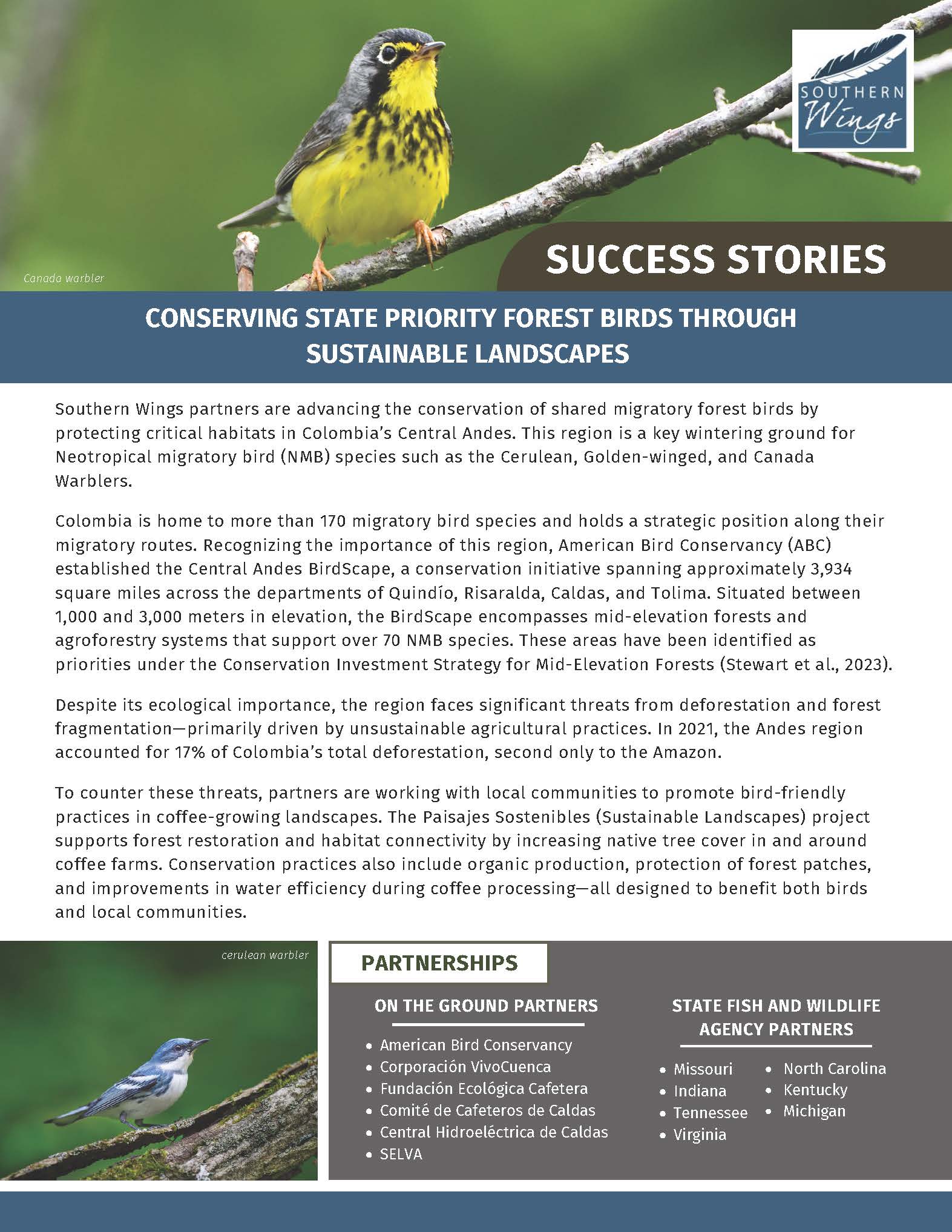 Colombia is home to more than 170 migratory bird species and holds a strategic position along their migratory routes. Recognizing the importance of this region, American Bird Conservancy (ABC) established the Central Andes BirdScape, a conservation initiative spanning approximately 3,934 square miles across the departments of Quindío, Risaralda, Caldas, and Tolima. Situated between 1,000 and 3,000 meters in elevation, the BirdScape encompasses mid-elevation forests and agroforestry systems that support over 70 NMB species. These areas have been identified as priorities under the Conservation Investment Strategy for Mid-Elevation Forests (Stewart et al., 2023).